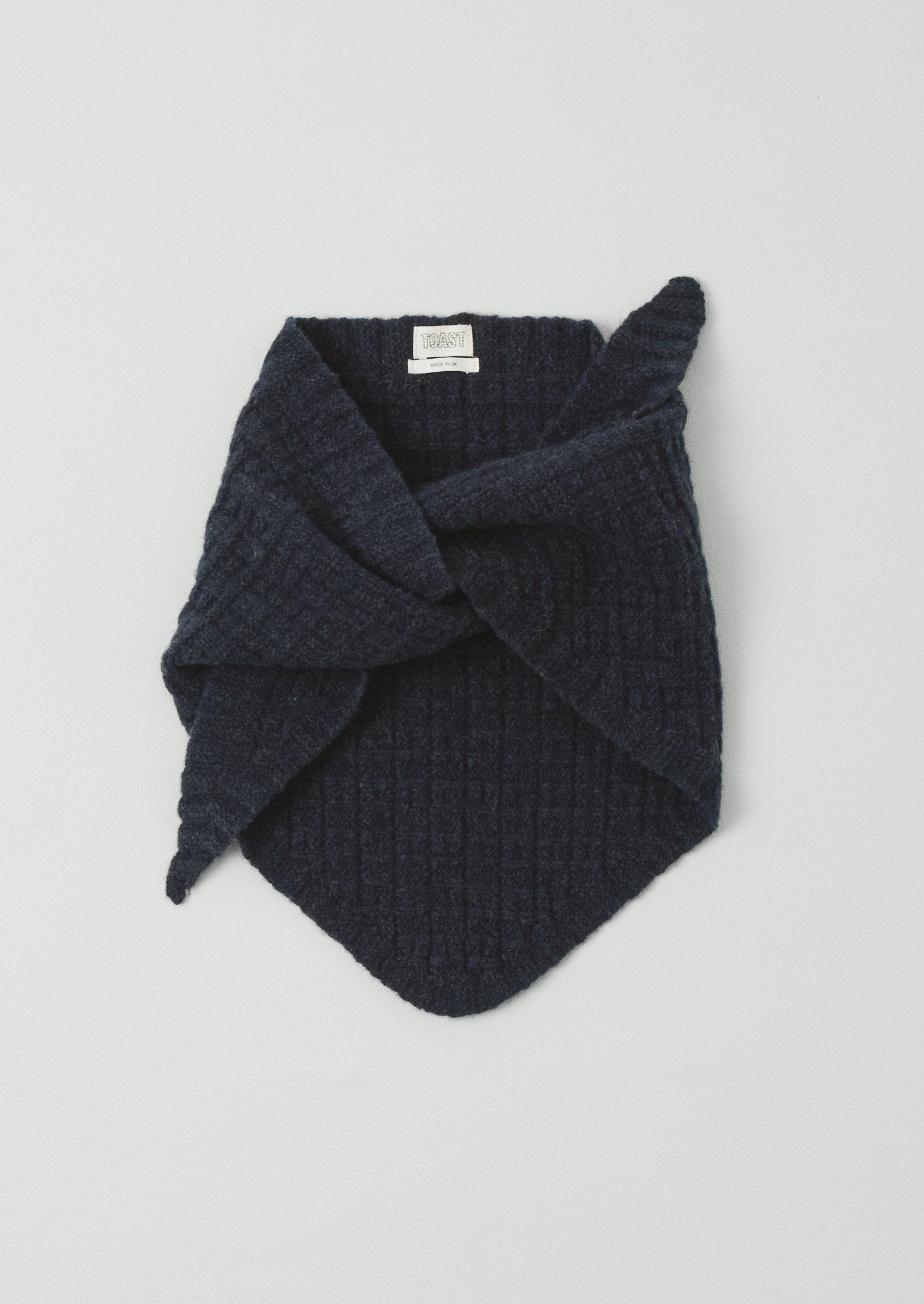 Bandana realizzata in lana d'agnello da Robert Mackie nell'Ayrshire, in Scozia. Lavorata a maglia con motivo a griglia.