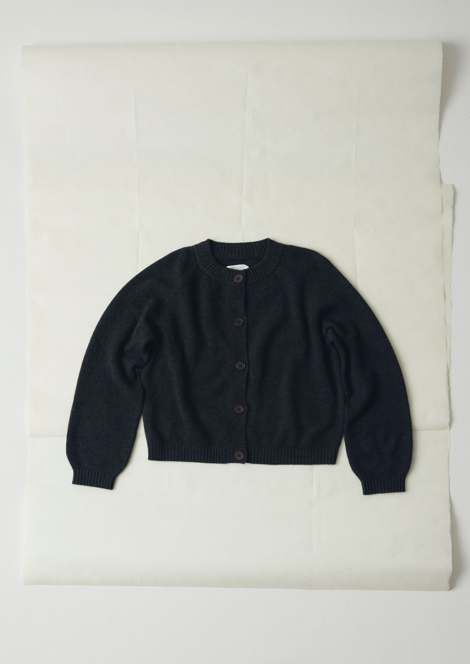La particolare sagomatura dei polsini del nostro cardigan crea una silhouette arrotondata. Realizzato in lana merino mista a cashmere riciclato, presenta una forma semplice con scollo arrotondato a coste, ed è rifinito con grandi bottoni in corozo.