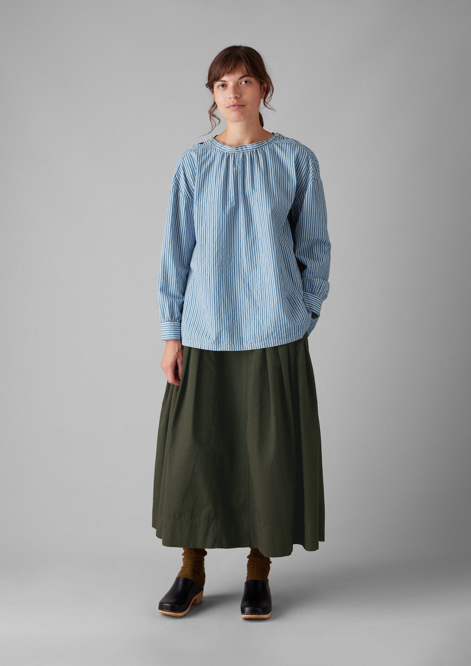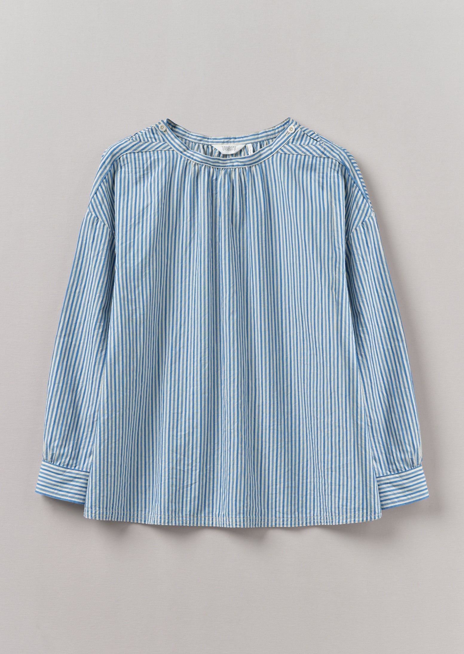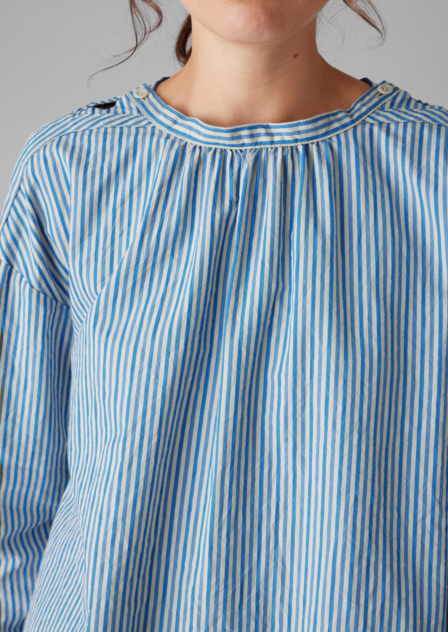 Le arricciature sullo scollo e sui polsini del nostro top a righe creano un senso di volume. Con un bottone in corozo sul collo e soffietti sotto le braccia per una maggiore facilità di indossamento.