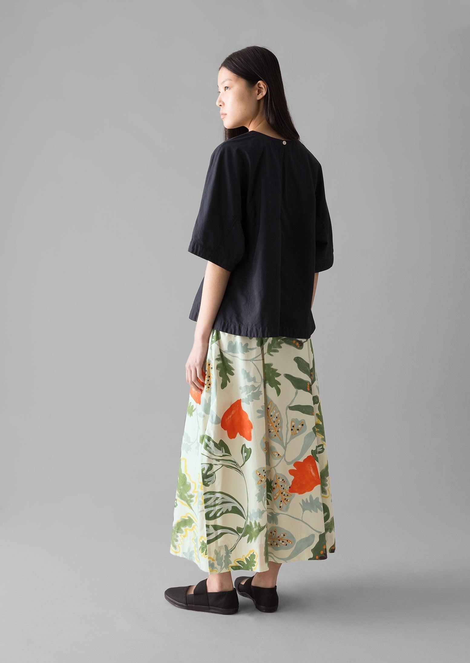 Popeline di cotone. Vestibilità comoda. Scollo a V. Spacchi laterali.