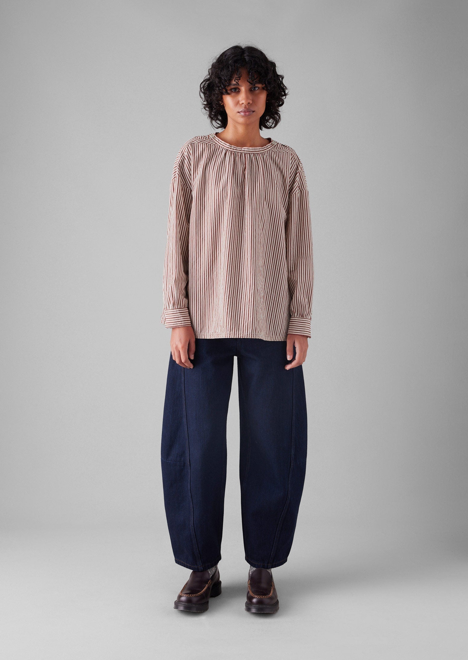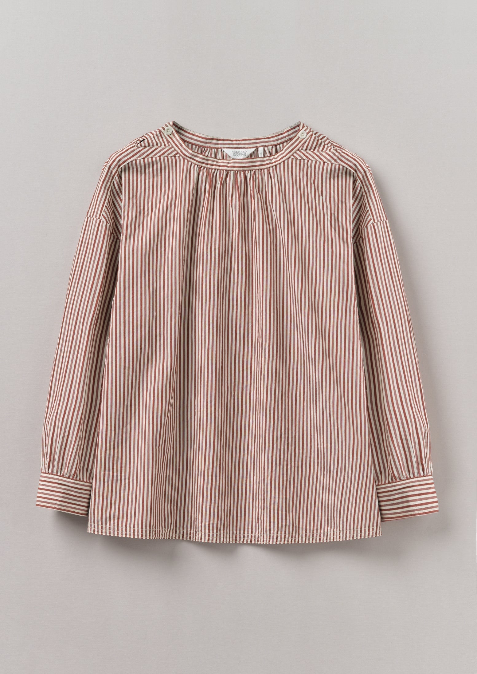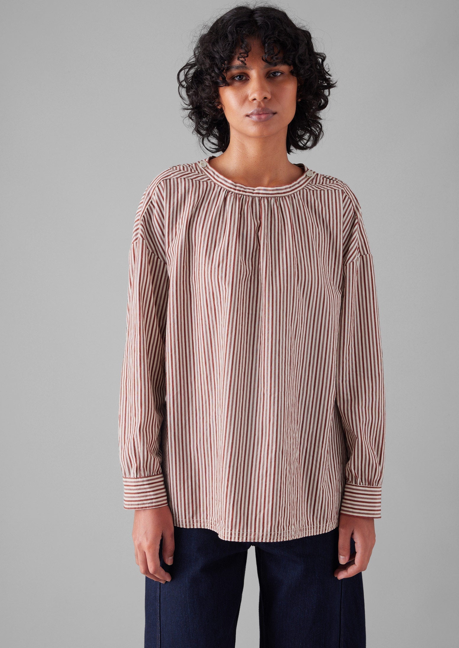 Top grembiule in cotone a righe con arricciature...
