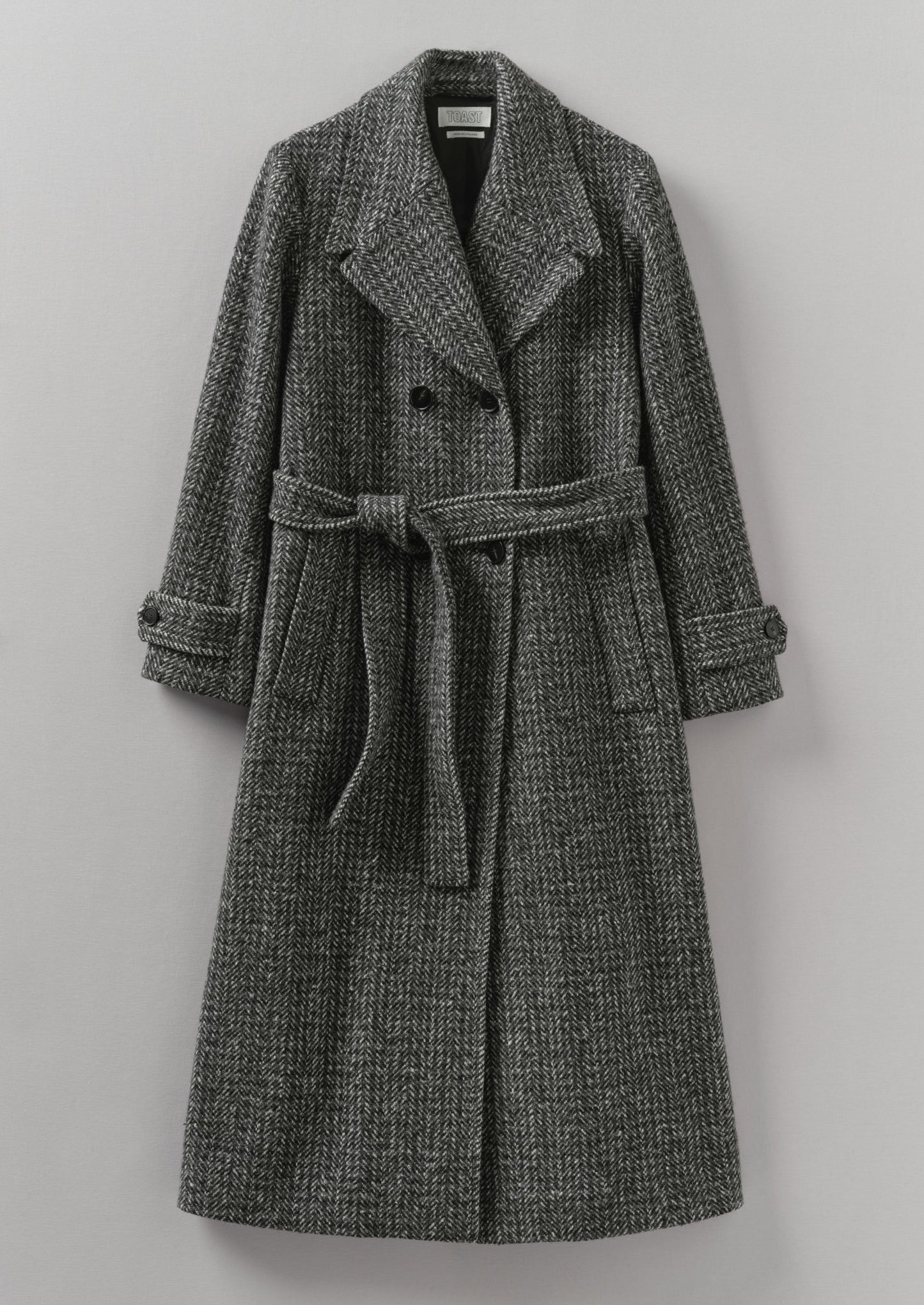 La cintura stringe la vita del nostro cappotto a spina di pesce per bilanciare la silhouette allungata e gli ampi revers. Realizzato in misto lana tessuto in Italia e completamente foderato in cotone.