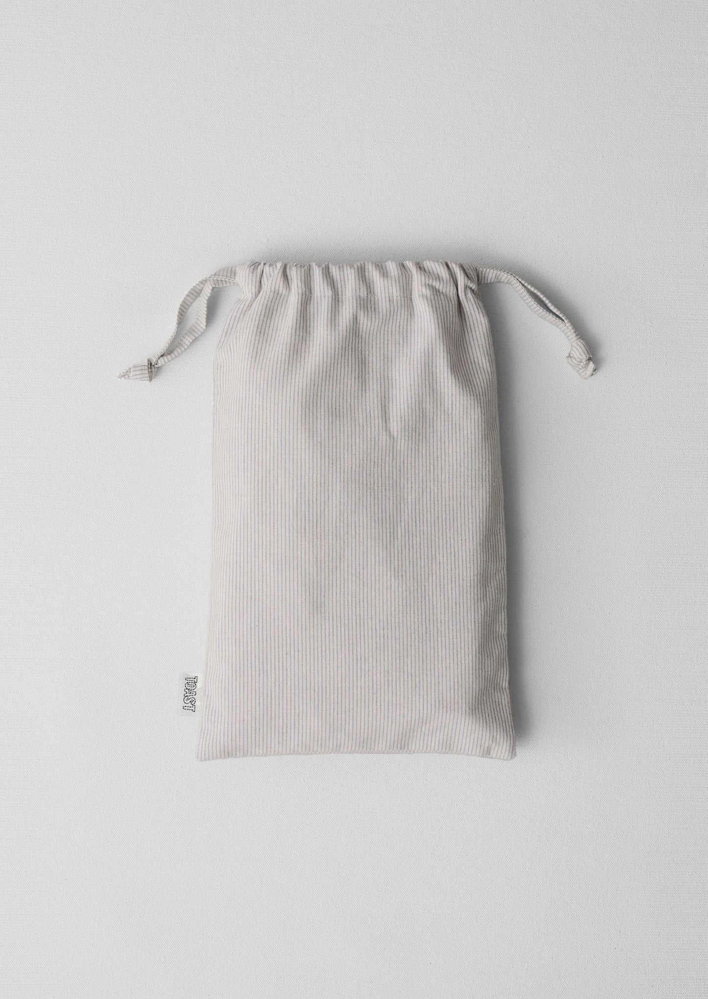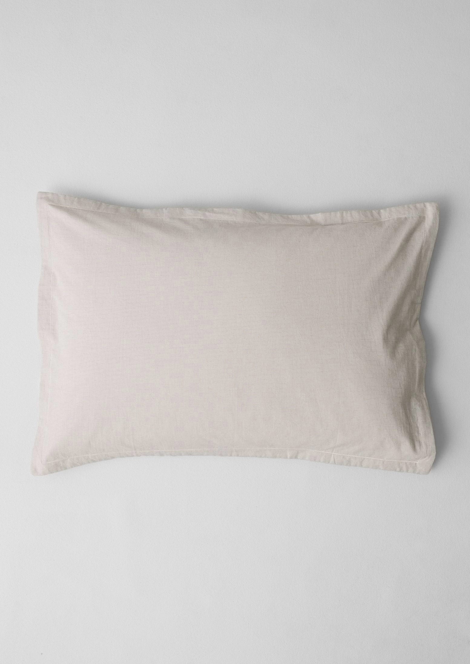 Un set di due federe tradizionali Oxford realizzate in cotone biologico intrecciato a righe sottili. Presentano un bordo cucito e una semplice chiusura a busta. Lavate per un look casual e accompagnate da una borsa in tessuto coordinata.