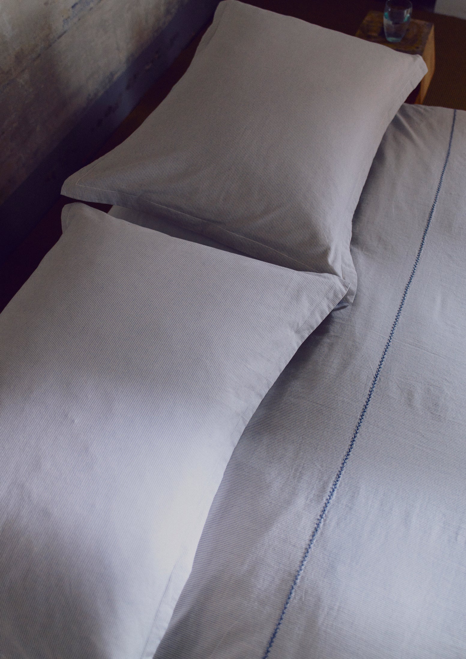 Set di federe in cotone biologico Oxford a righe sottili | Ecru/Blu fumo