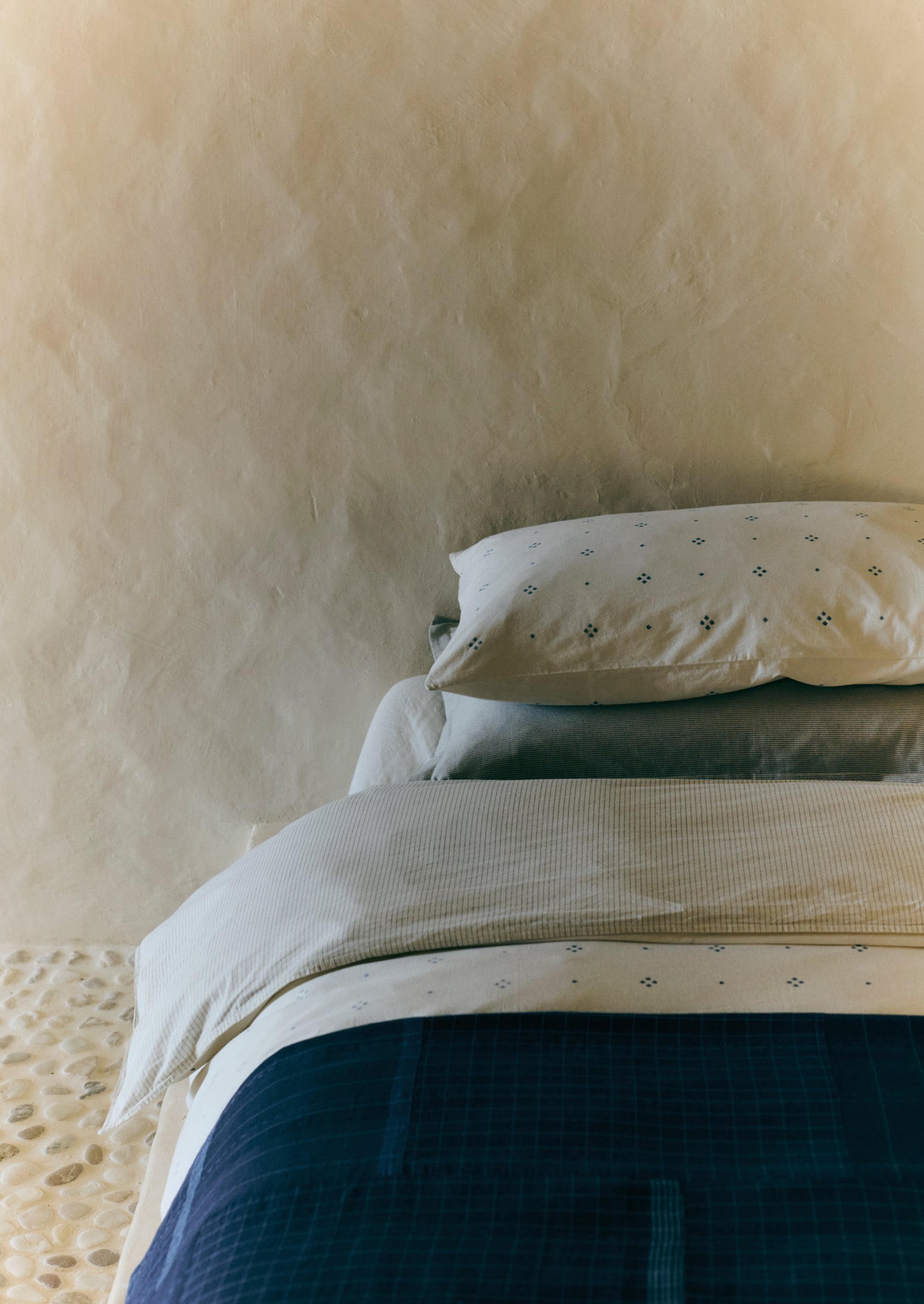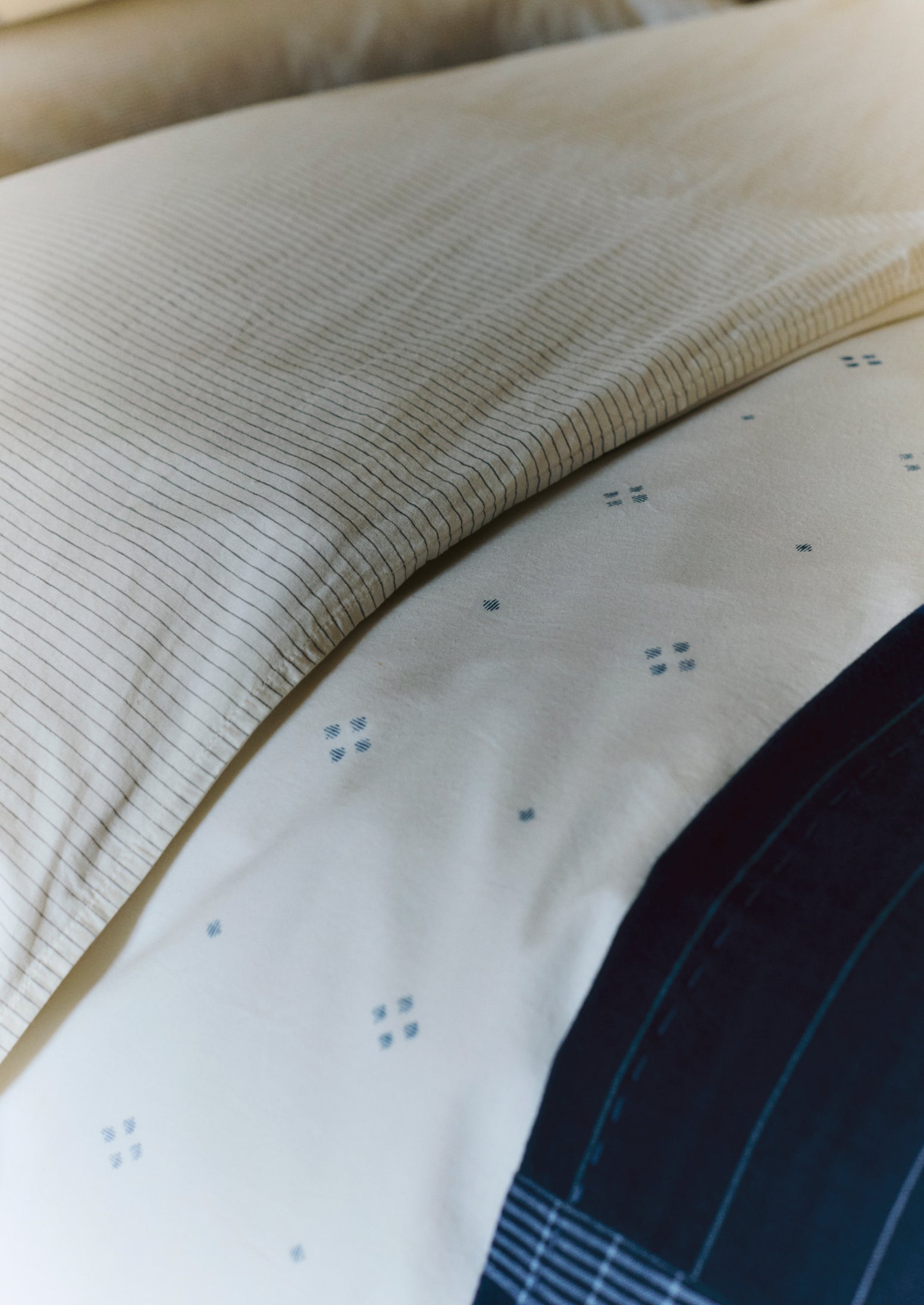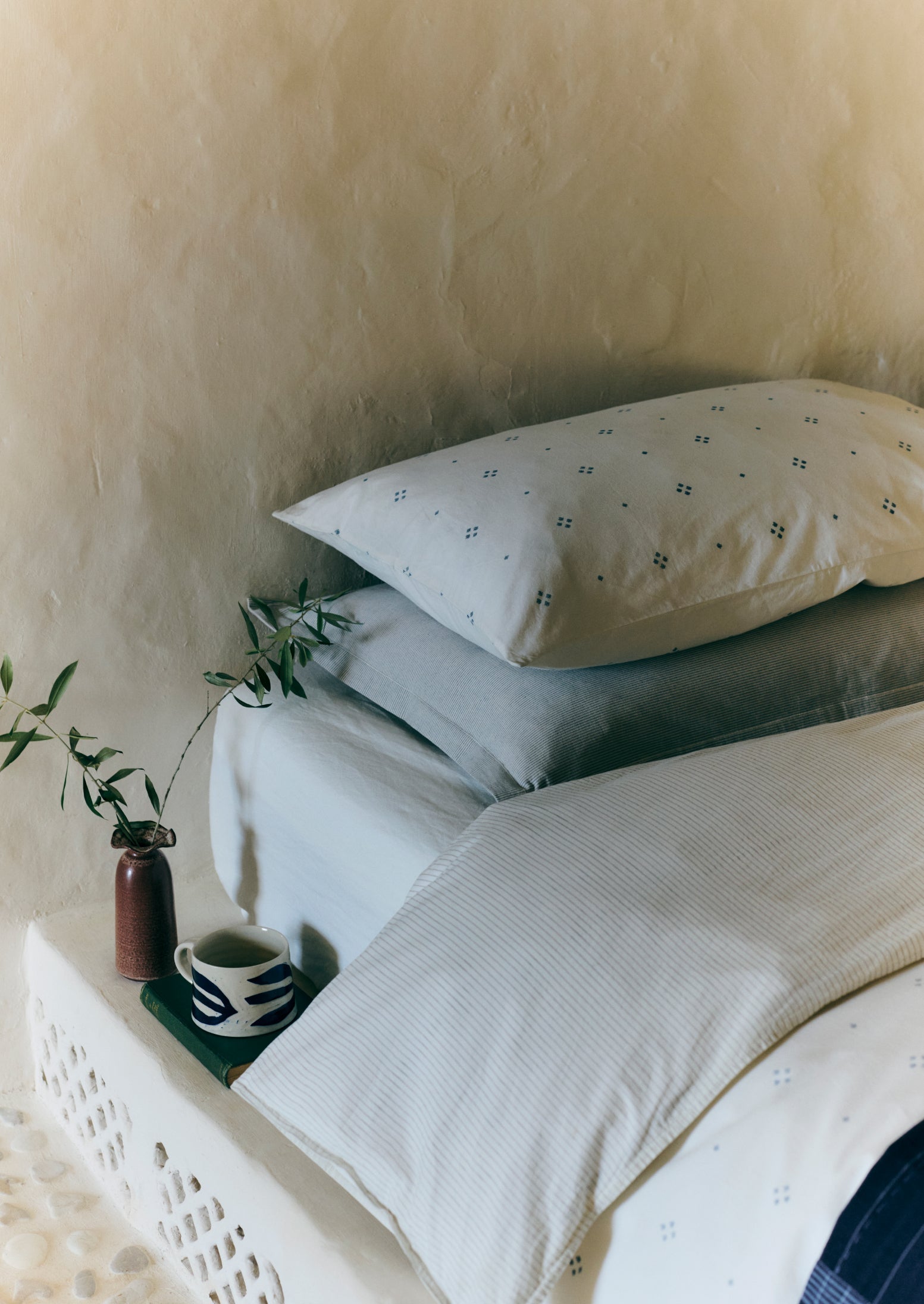 Morbida biancheria da letto in popeline di cotone con motivo a pois serigrafato sul davanti, in contrasto con sottili righe sul retro. Rifinita con bottoni ricoperti a righe, corredata da una borsa in tessuto coordinata.