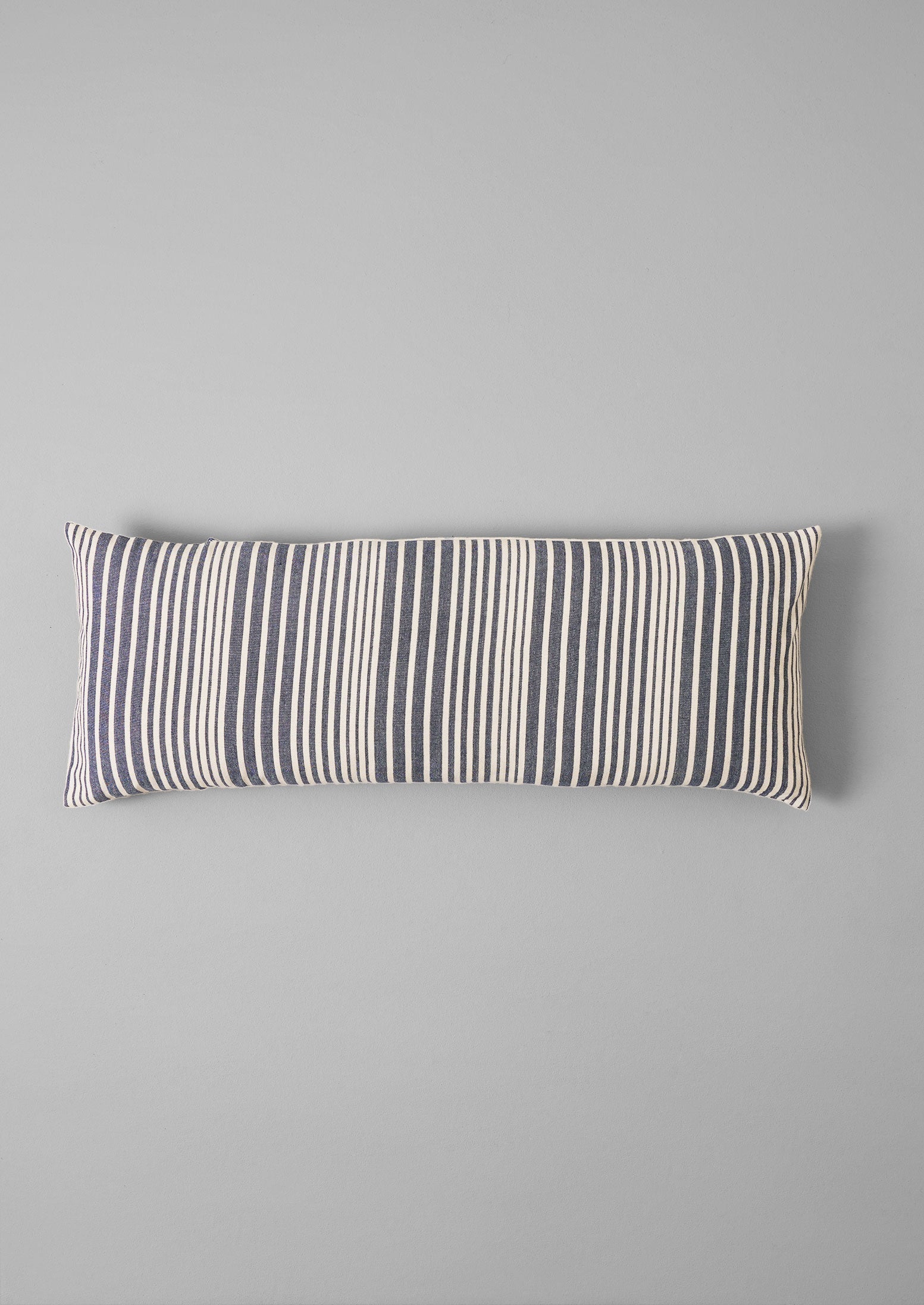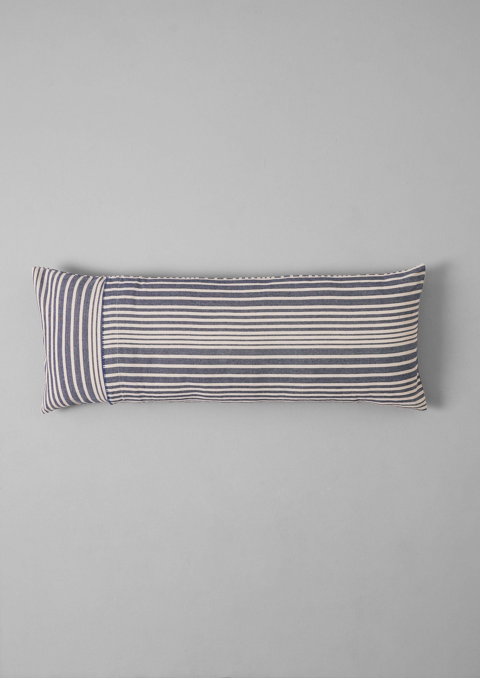 Cuscino a rullo in cotone tessuto a mano con righe tinte in filo. Con punto festone ricamato a mano a contrasto lungo la chiusura a busta. Include un cuscino in lana da 80 x 30 cm.