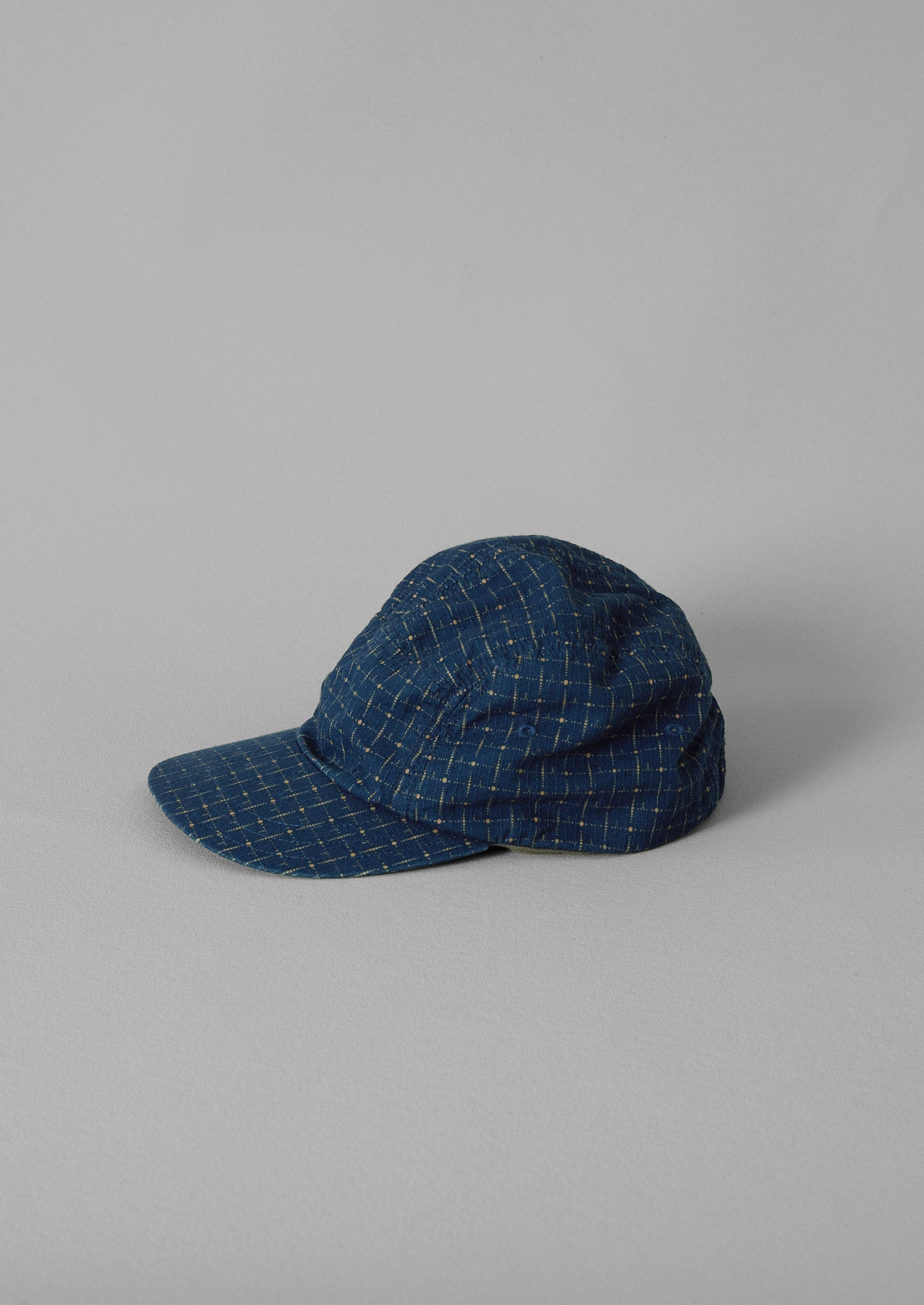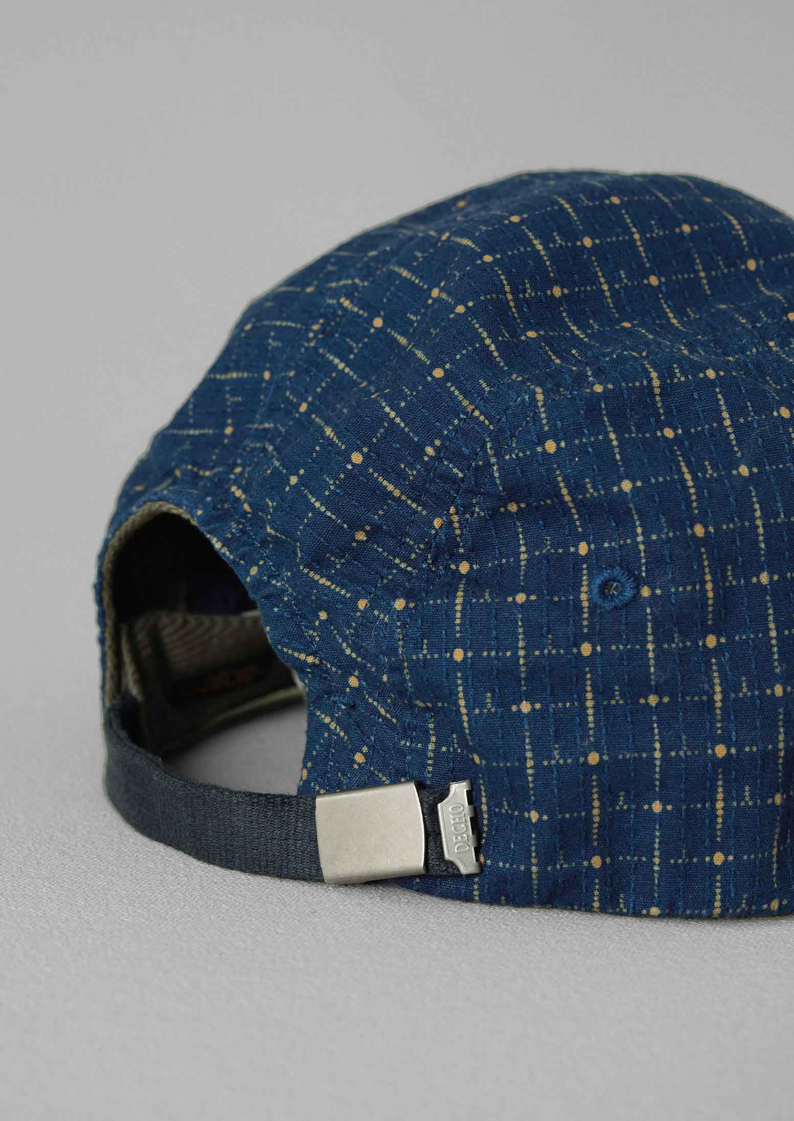 Questo berretto è realizzato in tessuto dobby tinto indaco e presenta un motivo a griglia. È dotato di una fibbia posteriore per regolare la taglia ed è progettato per resistere ai movimenti attivi. Decho è una piccola fabbrica di cappelli con sede a Okayama.