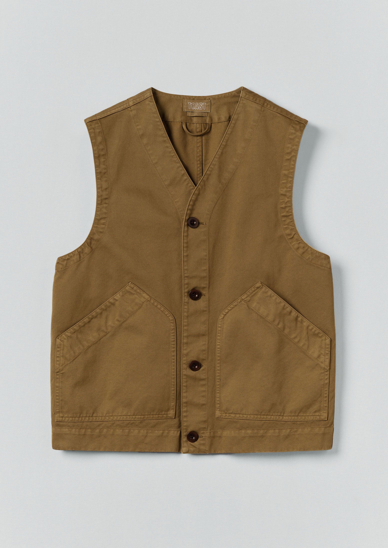 Twill di cotone tinto in capo per una variazione di colore naturale. Con scollo a V e tasche applicate. Ispirato ai modelli da lavoro. Rifinito con un passante interno per appendere. Parte della nostra collezione uomo.