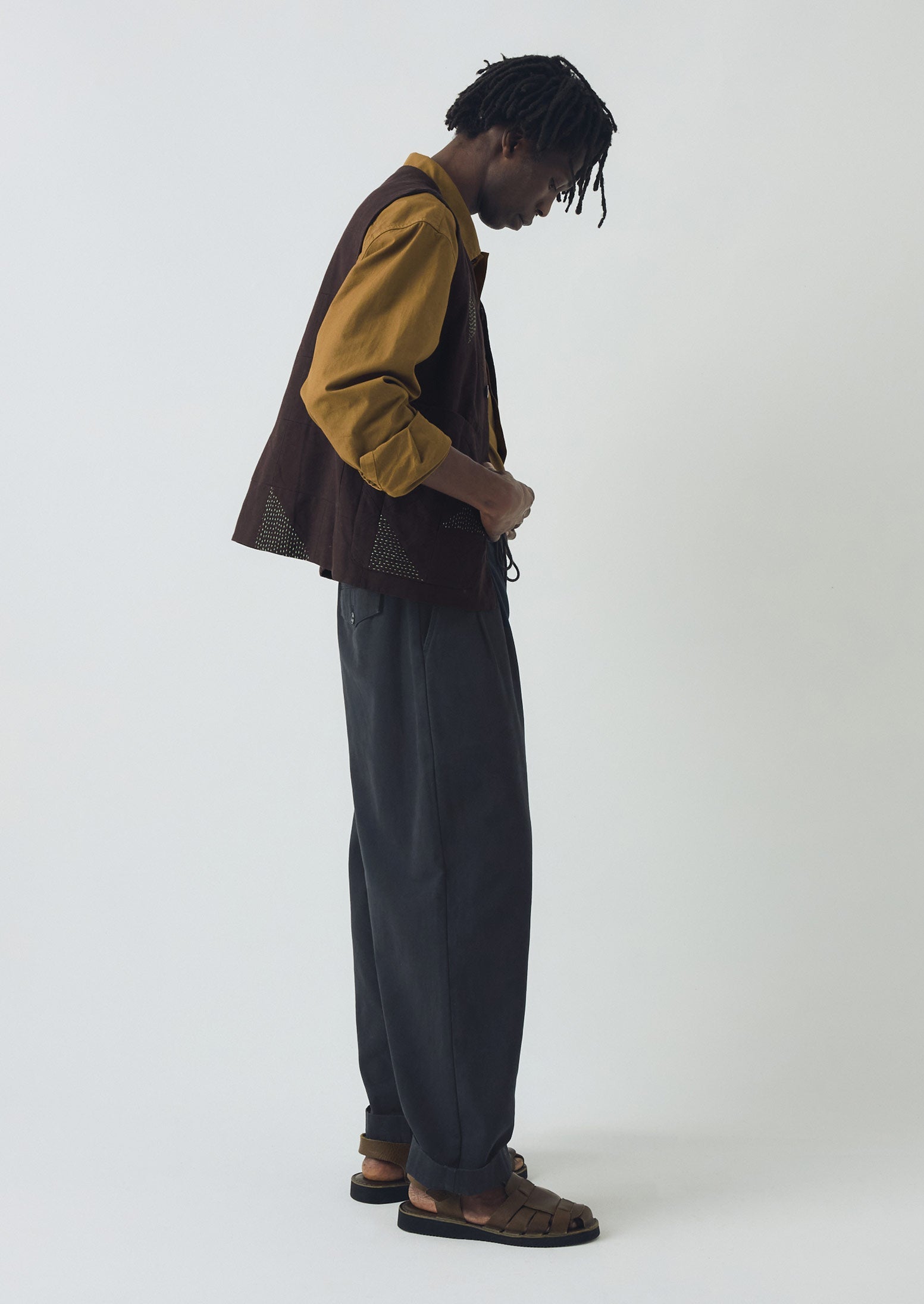 Il nostro gilet è realizzato in tela di cotone biologico patchwork. Ricamato con cuciture kantha a motivi triangolari tassellati, che ricordano la disposizione delle piastrelle in ceramica del XX secolo. Presenta uno scollo rotondo e si chiude con bottoni in corozo.