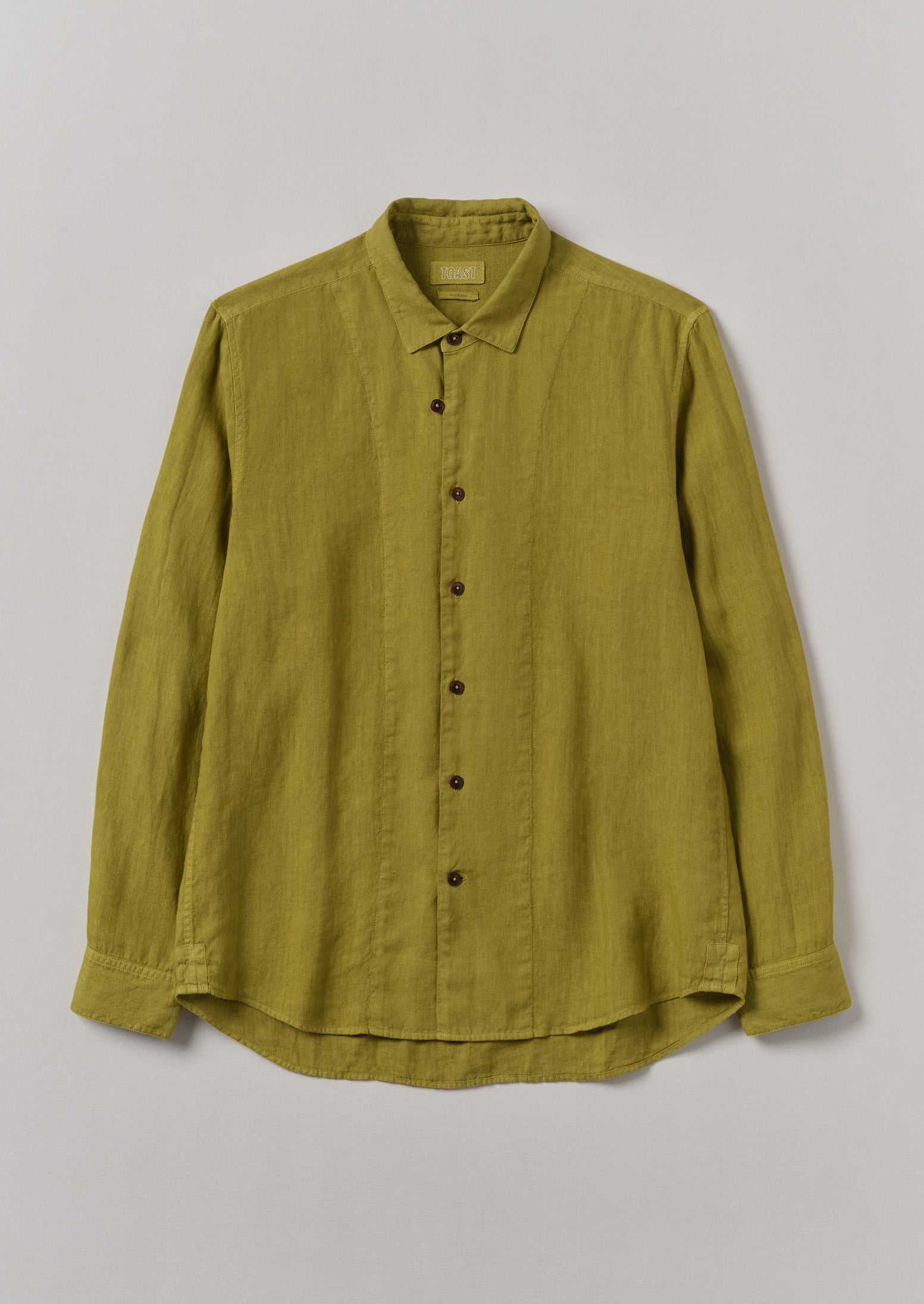 Lino. Tinto in capo. Colletto a punta piccola. Cuciture sulle spalle avanzate. Orlo curvo. Passante asimmetrico.