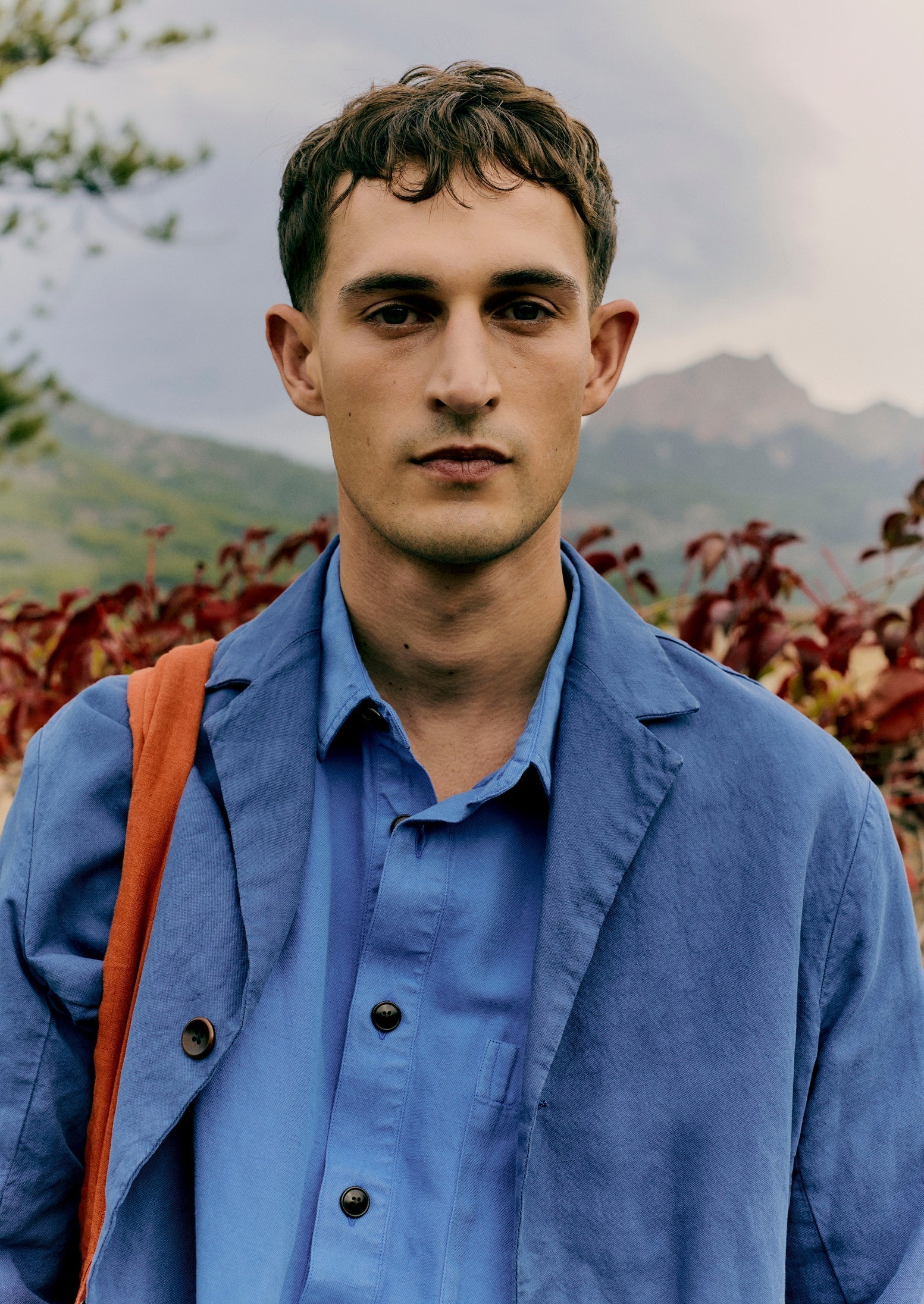 Twill di cotone e lino. Tinto in capo. Maniche al gomito. Lunghezza ai fianchi. Mezza abbottonatura. Bottoni in corozo. Orlo curvo.
