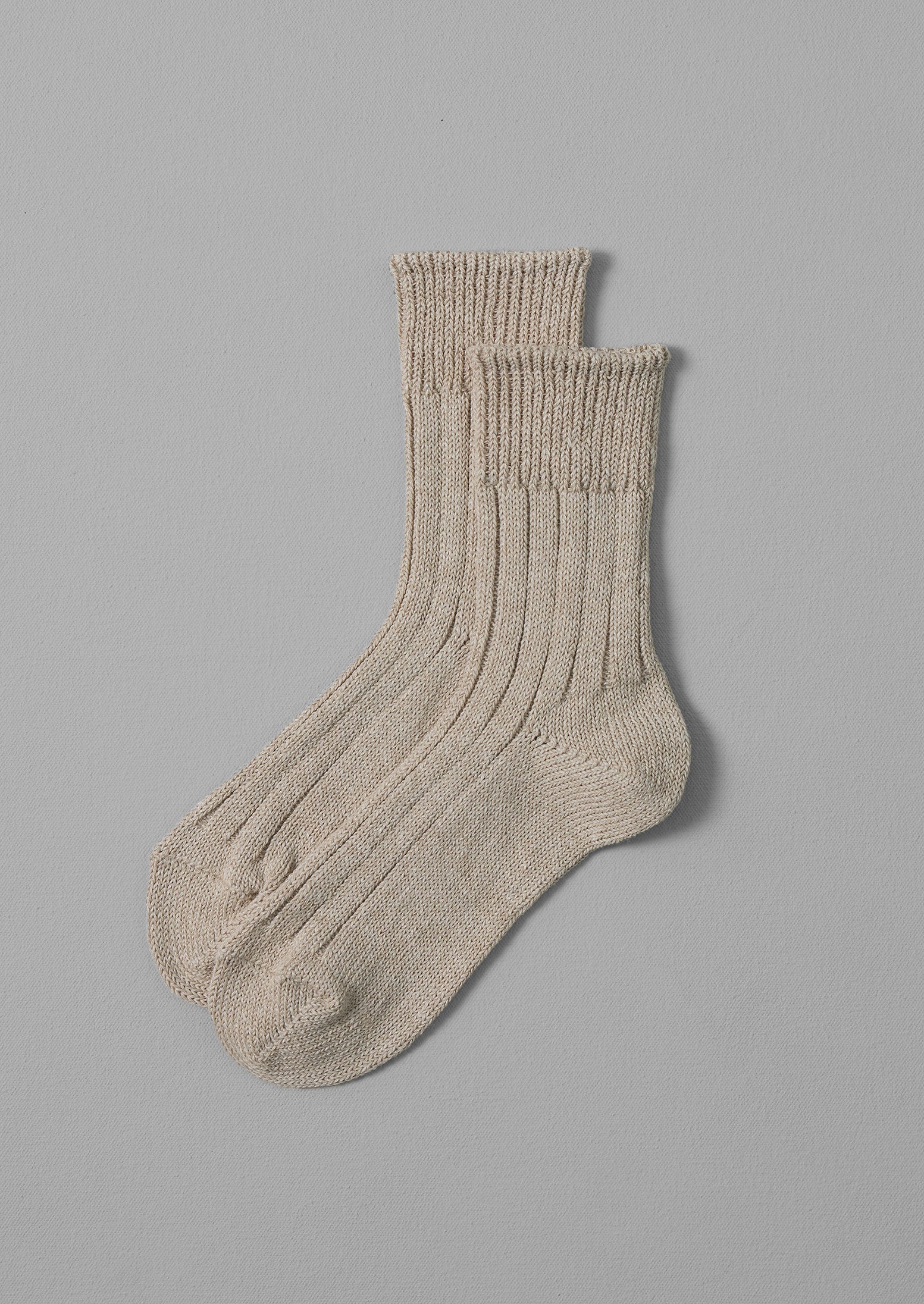 Calzini in misto lino di Decka, tessuti su macchine vintage in Giappone. Caratterizzati da una trama a coste larghe e una finitura maculata. Parte della nostra collezione uomo.