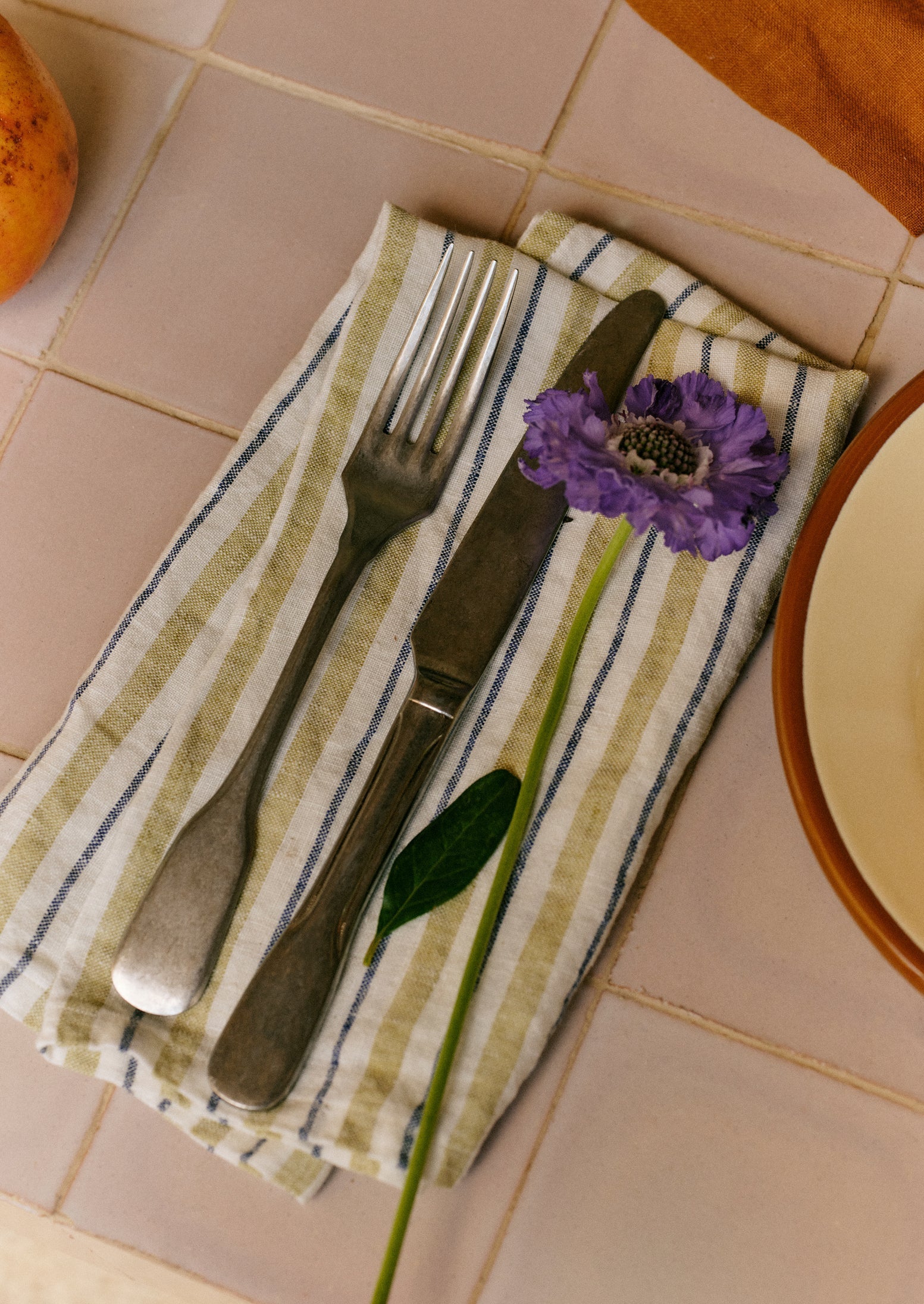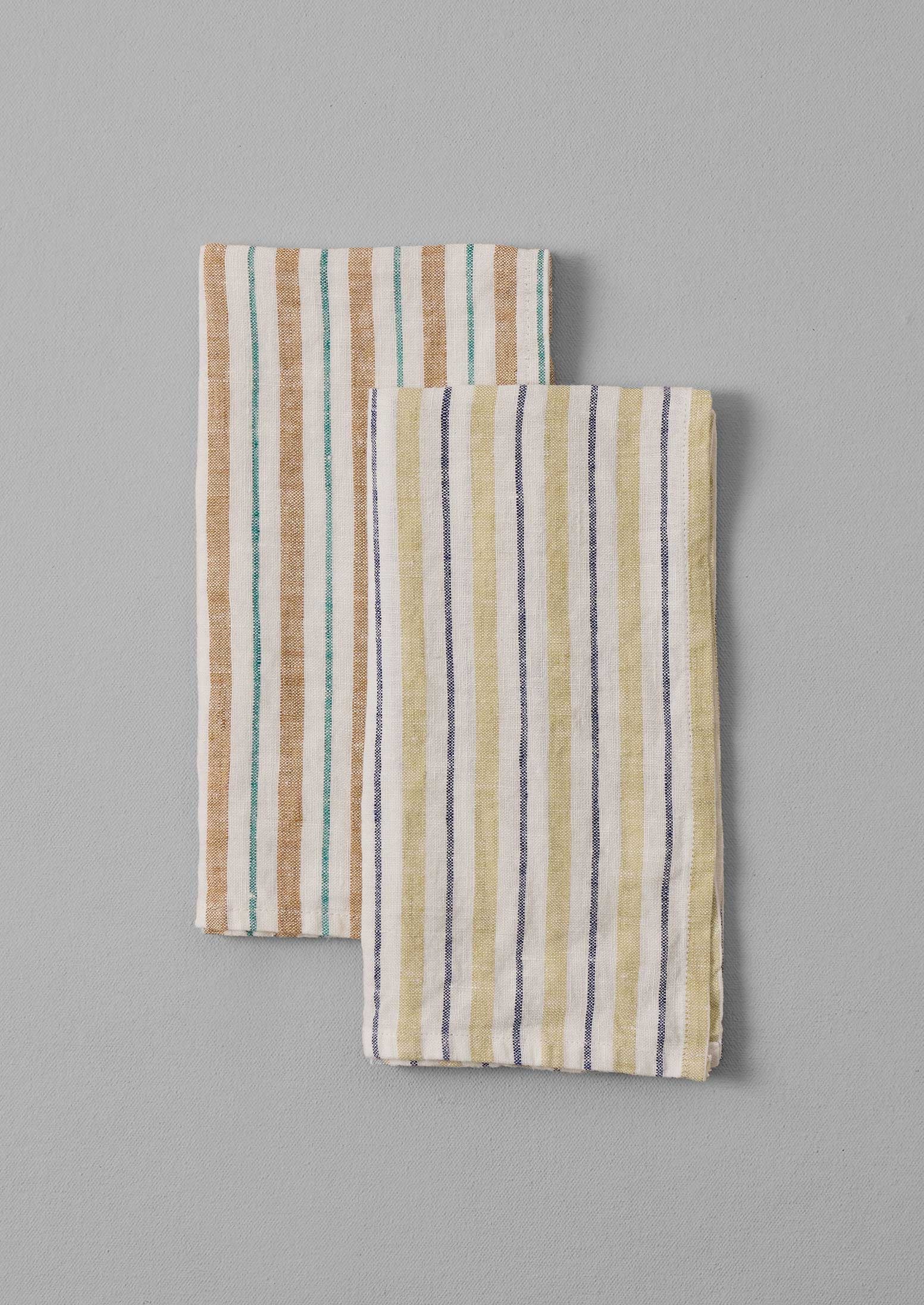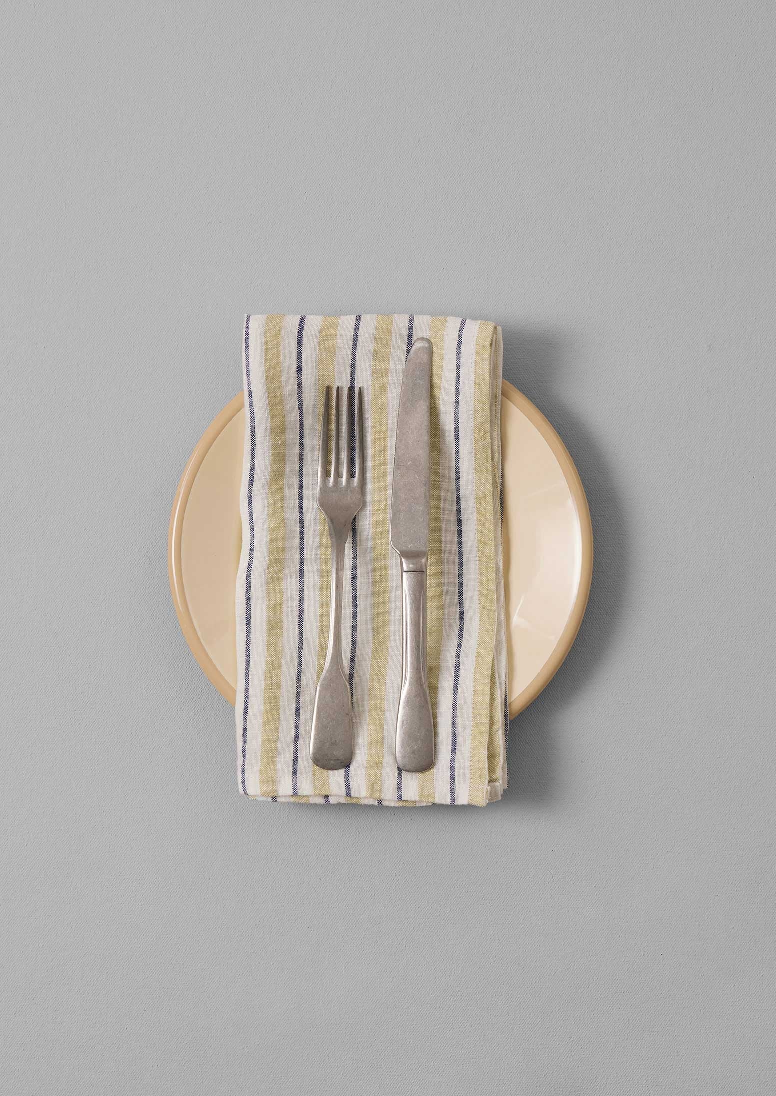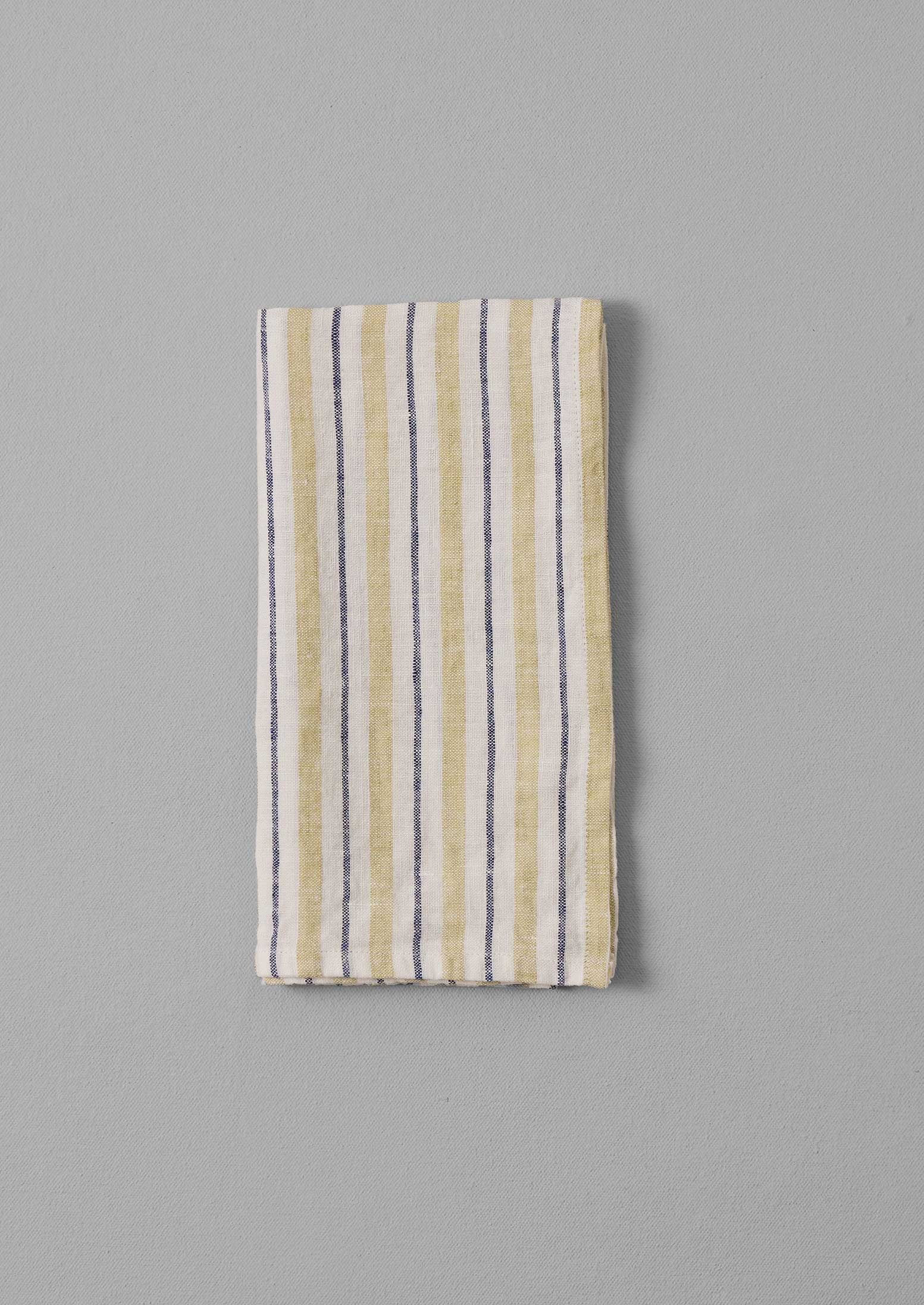 Tovagliolo tinto in filo, realizzato in morbido lino rigato, rifinito con bordi risvoltati.
