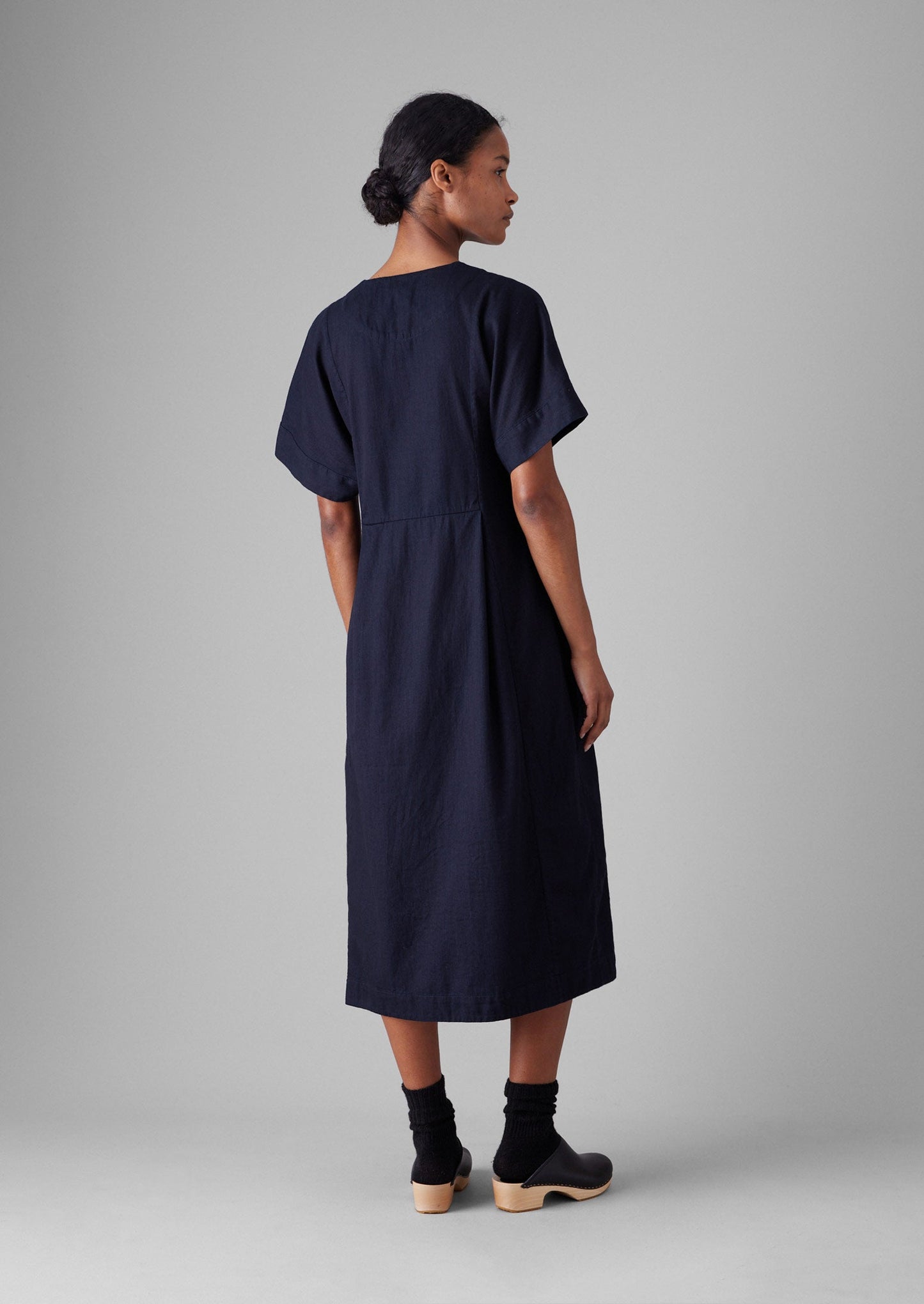 Il nostro abito Bryn è realizzato in twill di cotone tinto indaco e presenta una silhouette ampia. Presenta ampie maniche a dolman e tasche laterali e arriva fino al polpaccio.