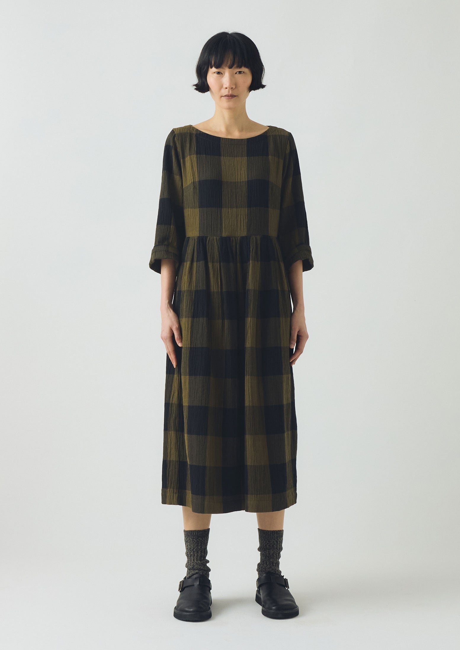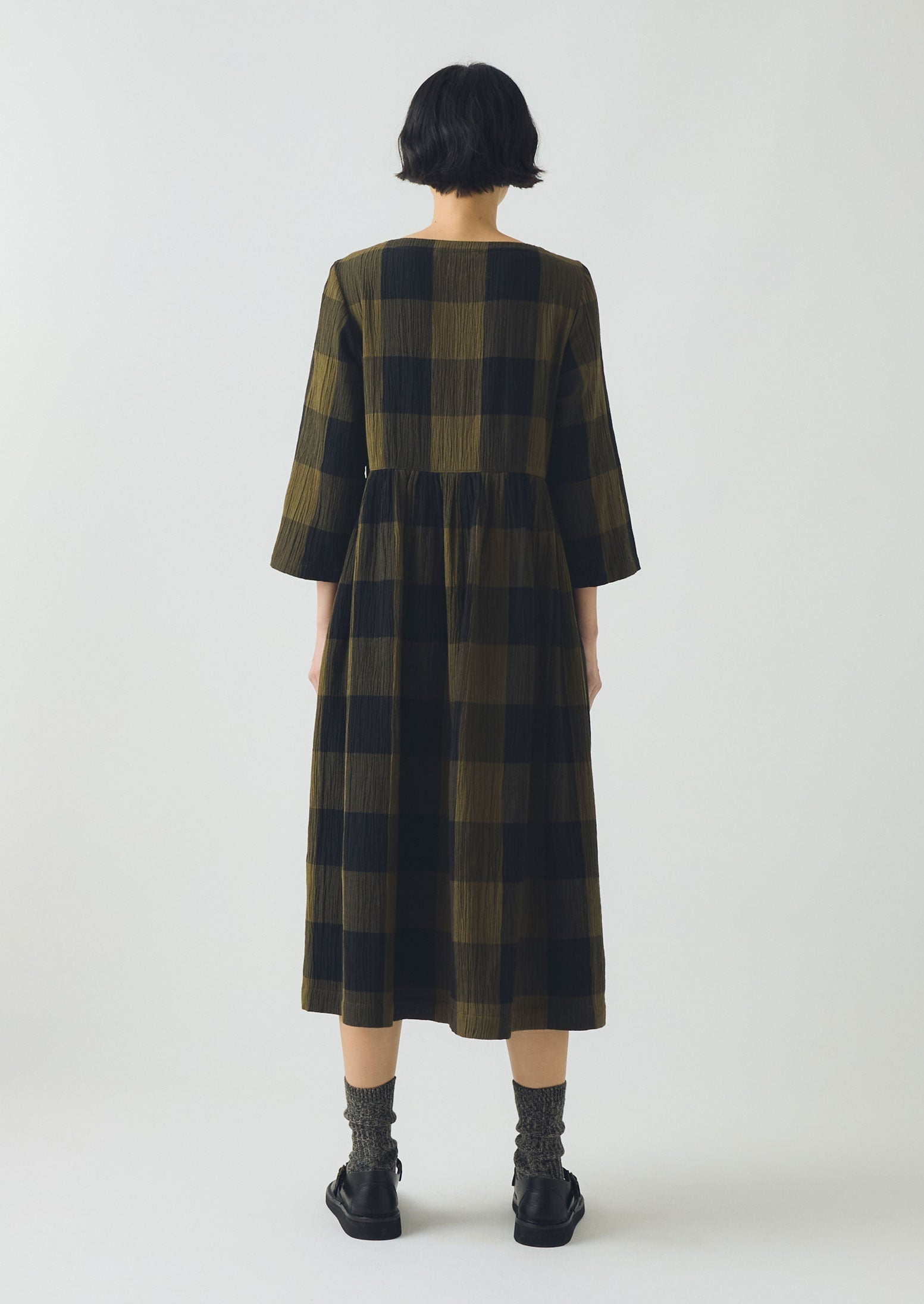 Il nostro abito a quadretti macro è realizzato in cotone stropicciato double-face. Con una texture leggera, le arricciature sotto la vita creano movimenti fluidi. Le maniche a tre quarti possono essere ripiegate per accorciarle o indossate così come sono.