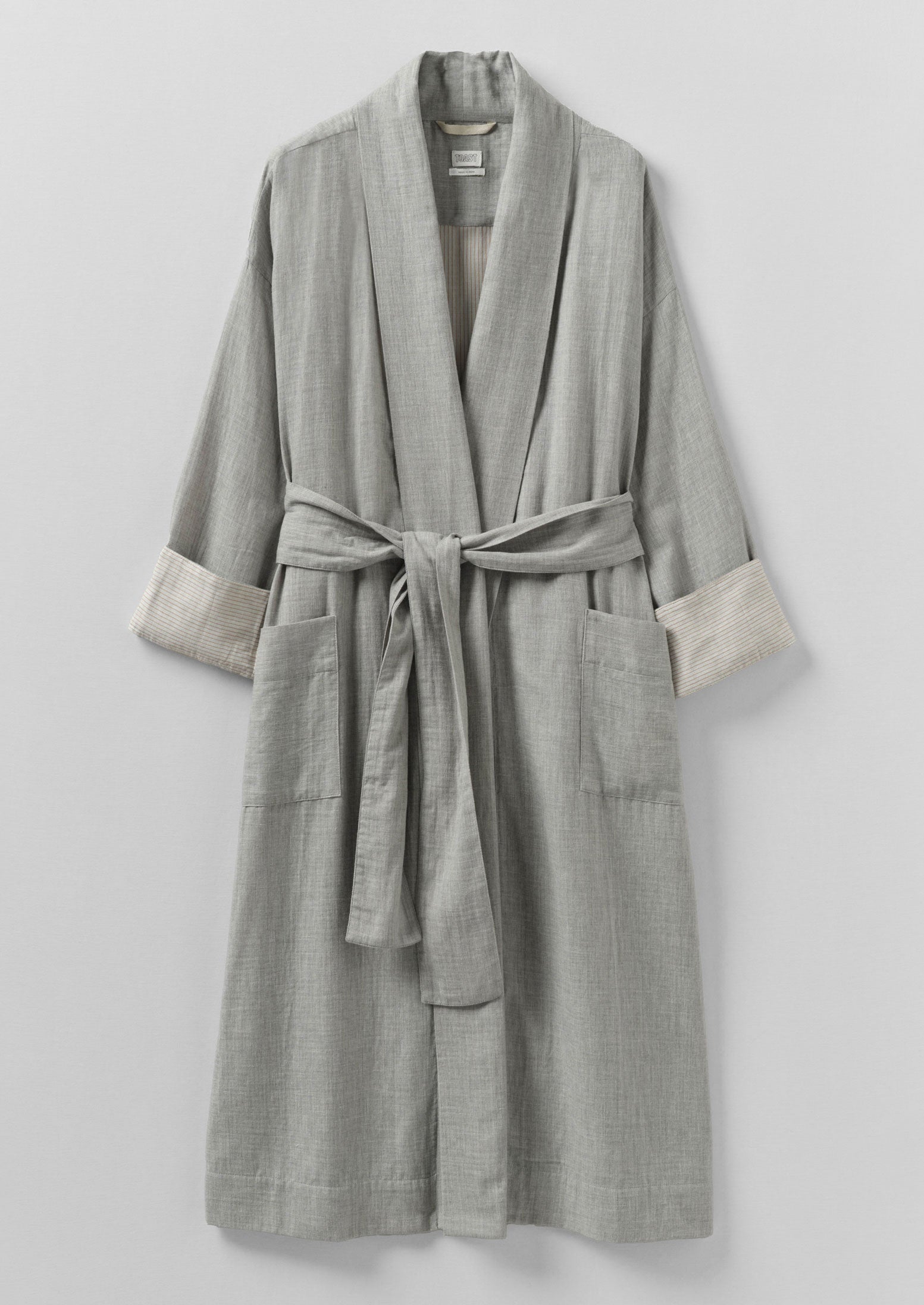 Morbido cotone double-face. Interno in cotone a righe. Forma ergonomica. Laccetto in vita. Tasche laterali. Passante interno per appendere.