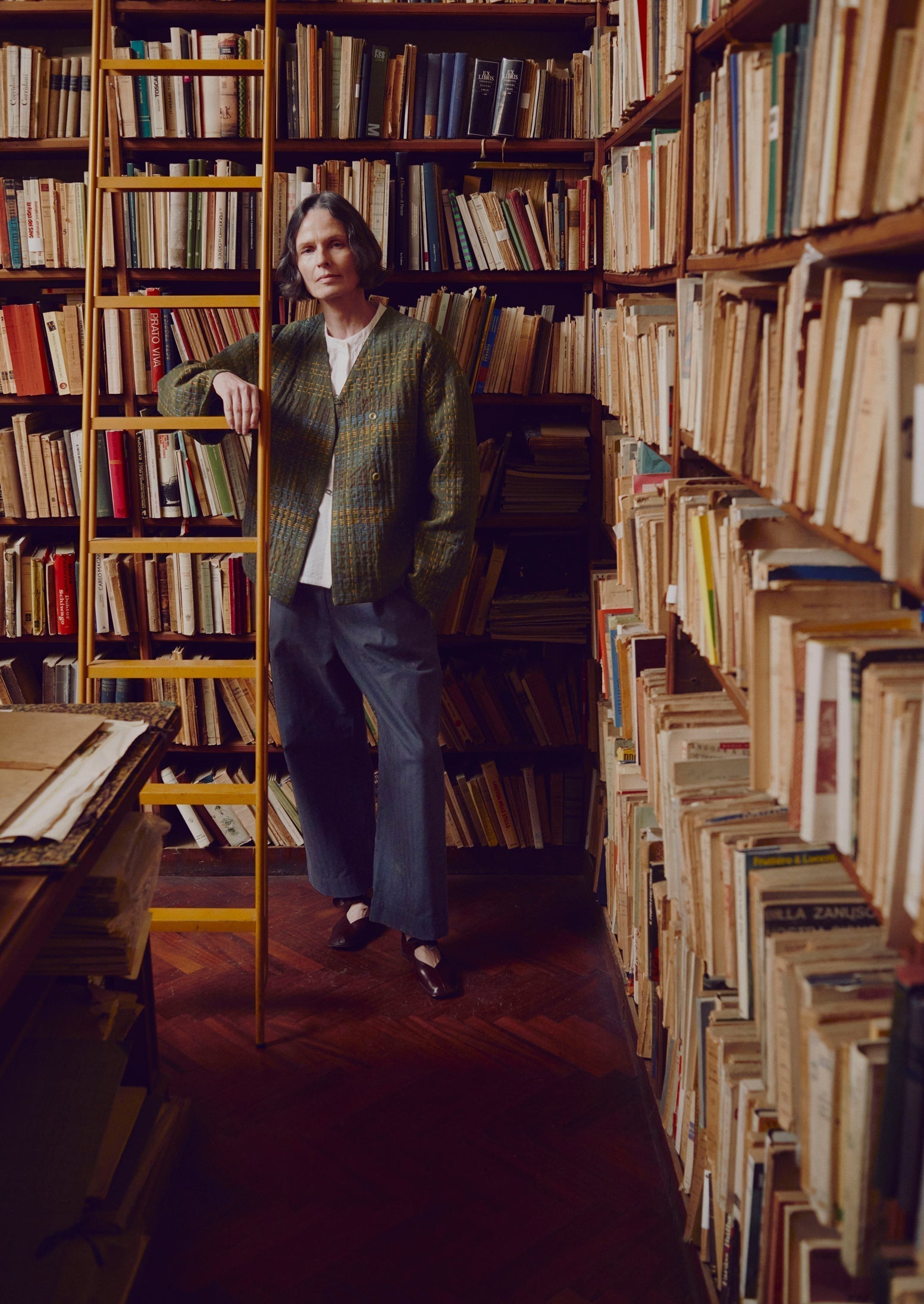 La modella dello studio Gwen è alta 176 cm e indossa una taglia 8.