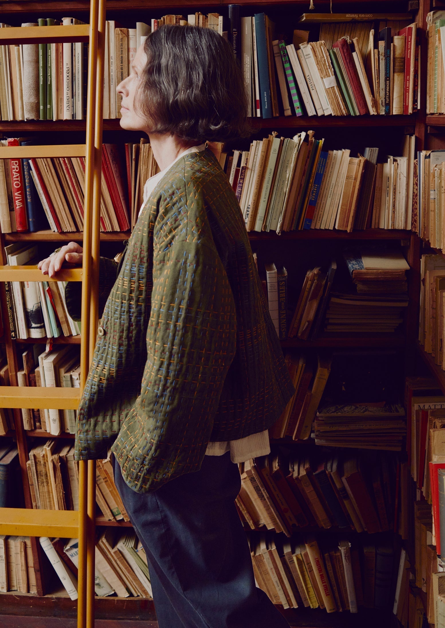 Giacca in cotone biologico. Leggermente imbottita. Fodera in cotone. Kantha. Forma comoda. Chiusura con bottoni e passanti. Scollo a V. Bottone in corozo. Tasche inserite nelle cuciture.