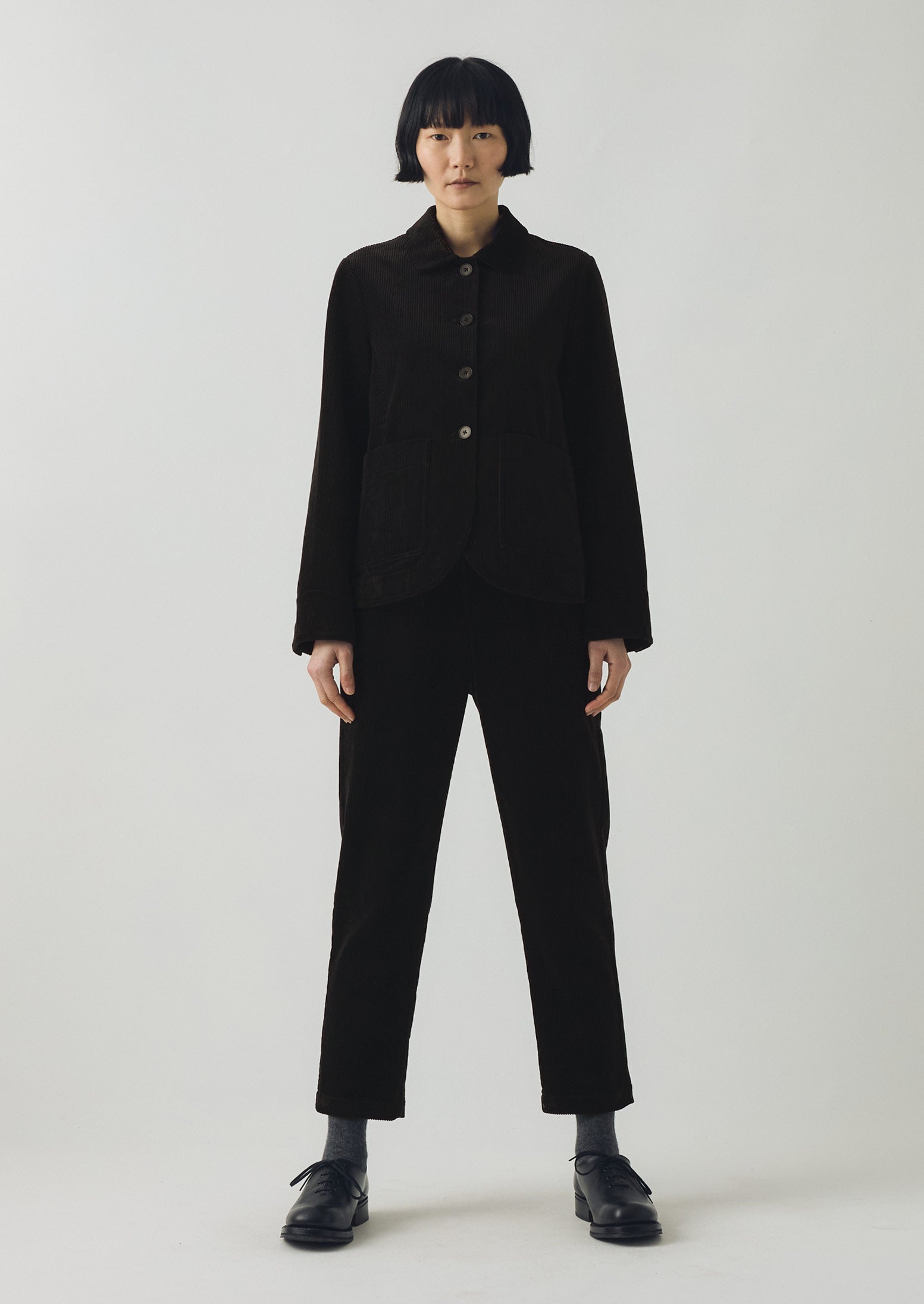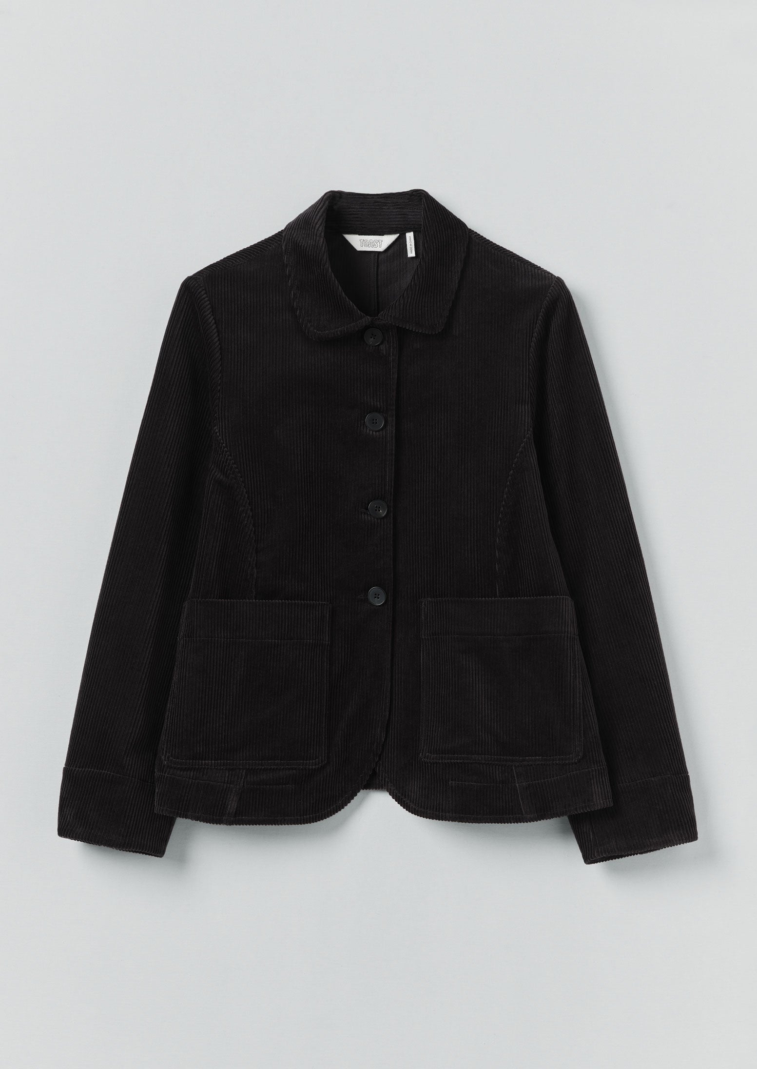 Giacca realizzata in velluto di cotone biologico, dalla linea morbida e strutturata e con orlo arrotondato. Rifinita con colletto arrotondato, bottoni in corno e due tasche applicate con impunture.