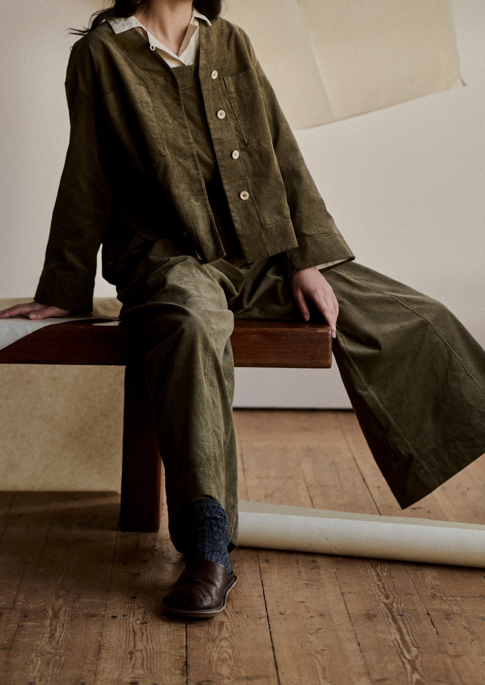 Velluto in cotone biologico. Scollo quadrato. Gambe larghe. Bottoni in corozo. Apertura laterale con bottoni.
