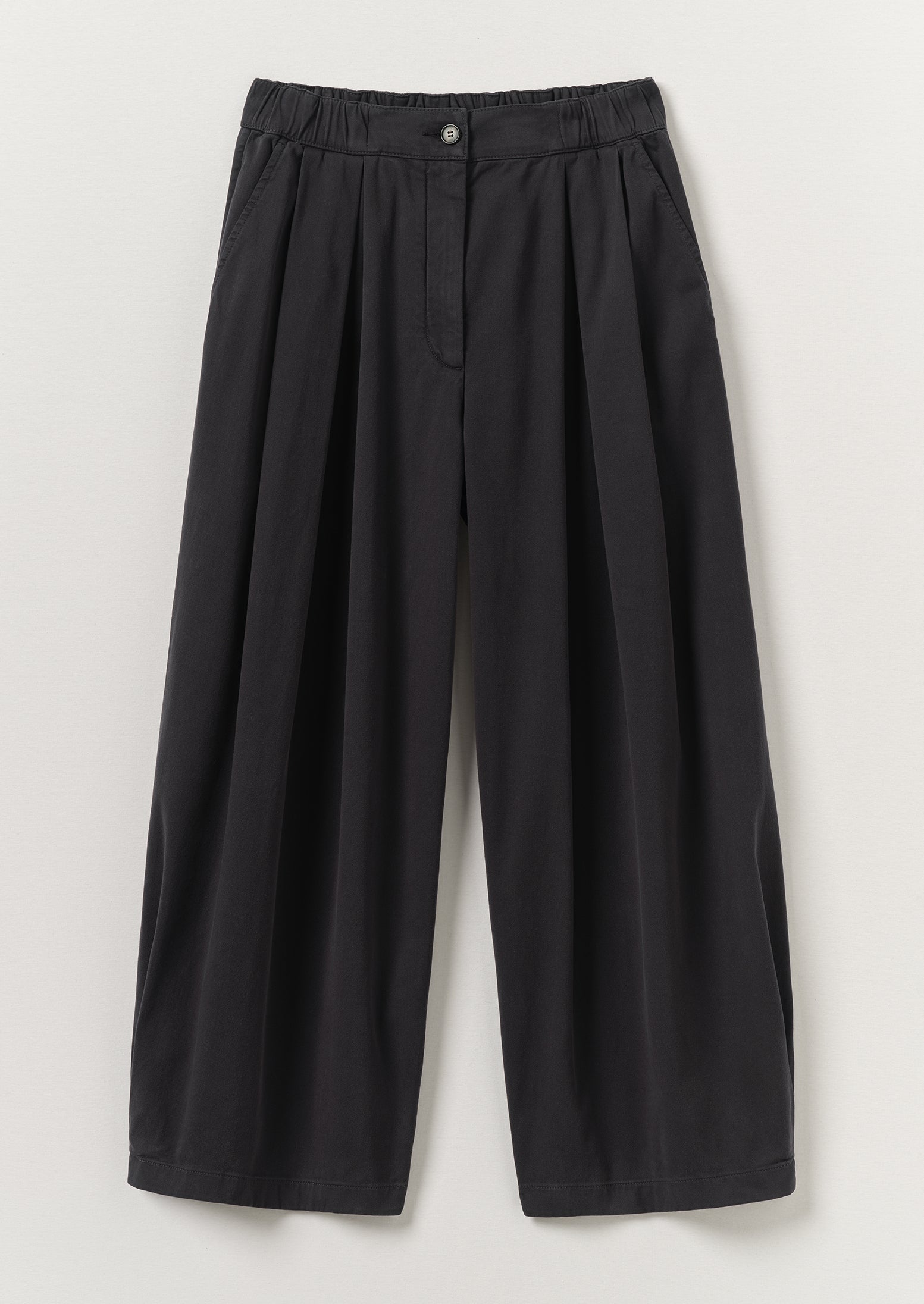 Cotone. Tinto in capo. Vestibilità comoda. Vita elasticizzata. Pieghe a cannoncino invertite sul davanti. Tasca posteriore applicata. Gambe larghe fino alla caviglia. Cerniera e bottone in corozo.