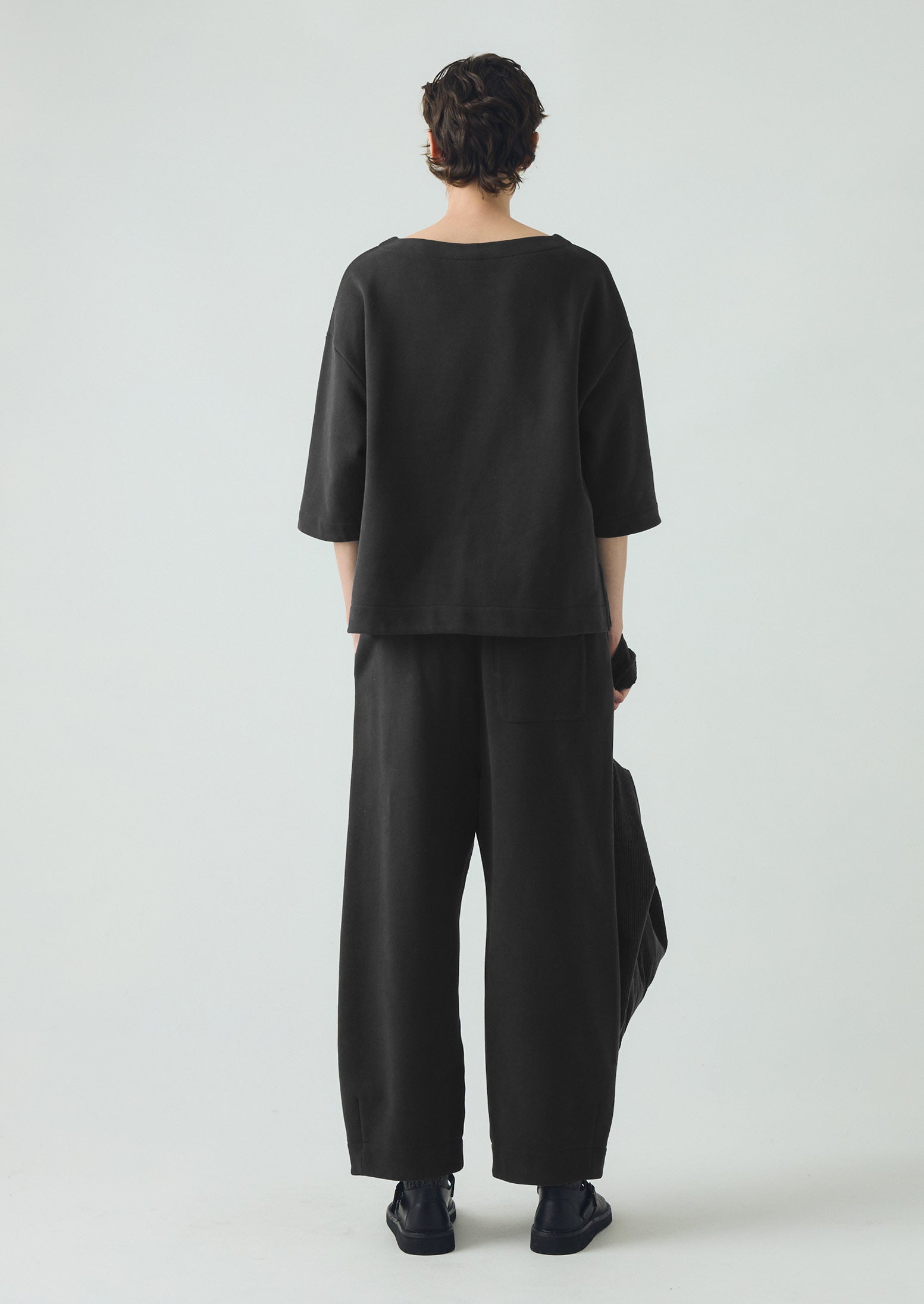 La forma a botte dona volume alle gambe dei nostri pantaloni, realizzati in jersey di cotone biologico. Con elastico in vita e tasca posteriore applicata.