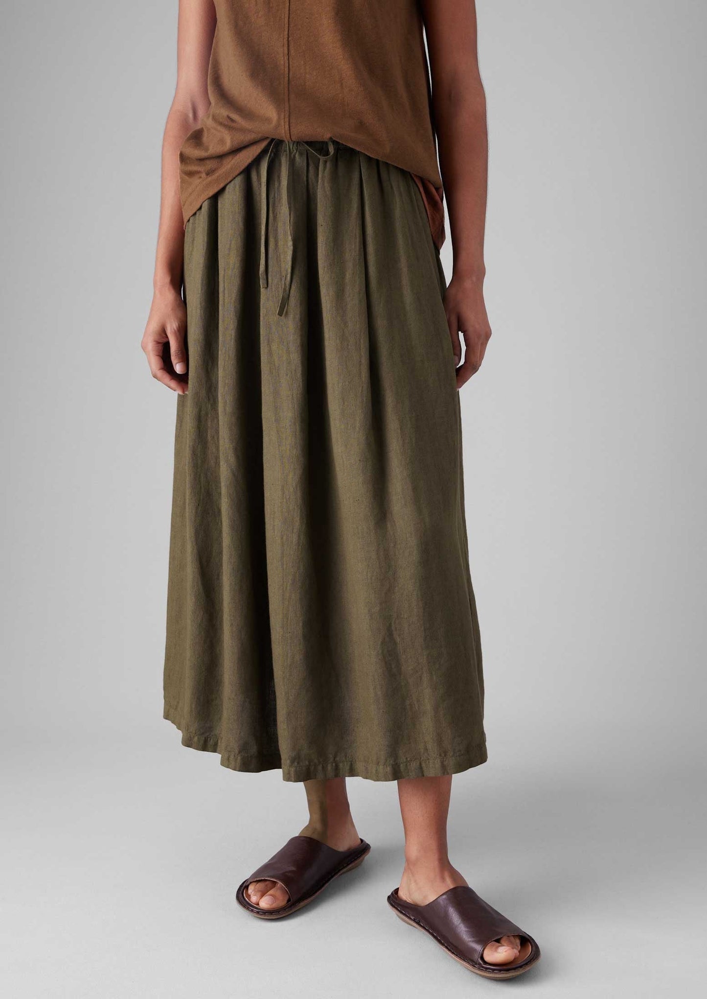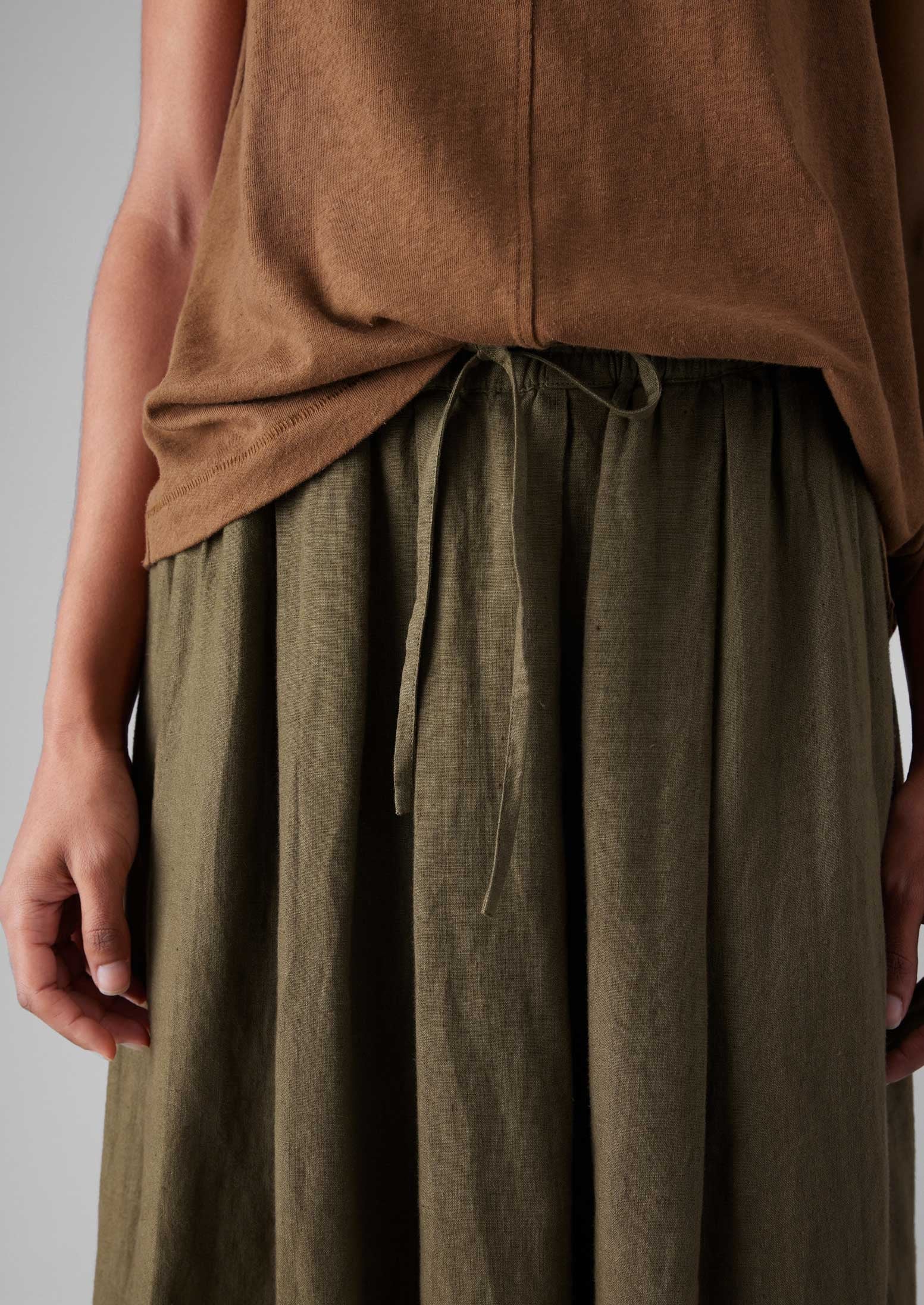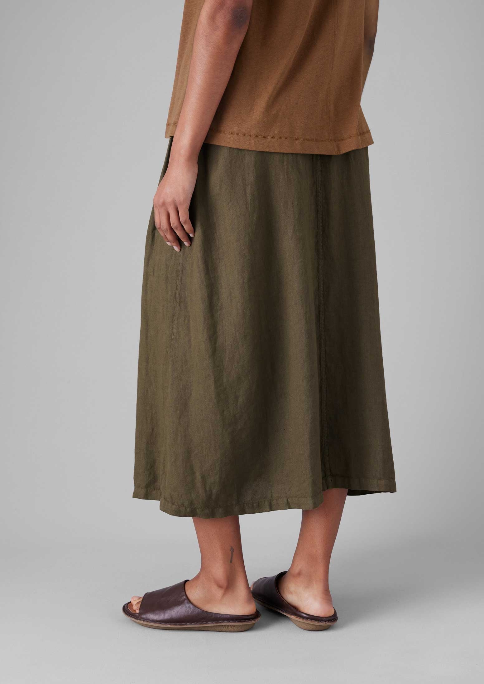 Lino. Tinto in capo. Elasticizzato in vita. Vestibilità comoda. Tasche laterali. Lunghezza al polpaccio.