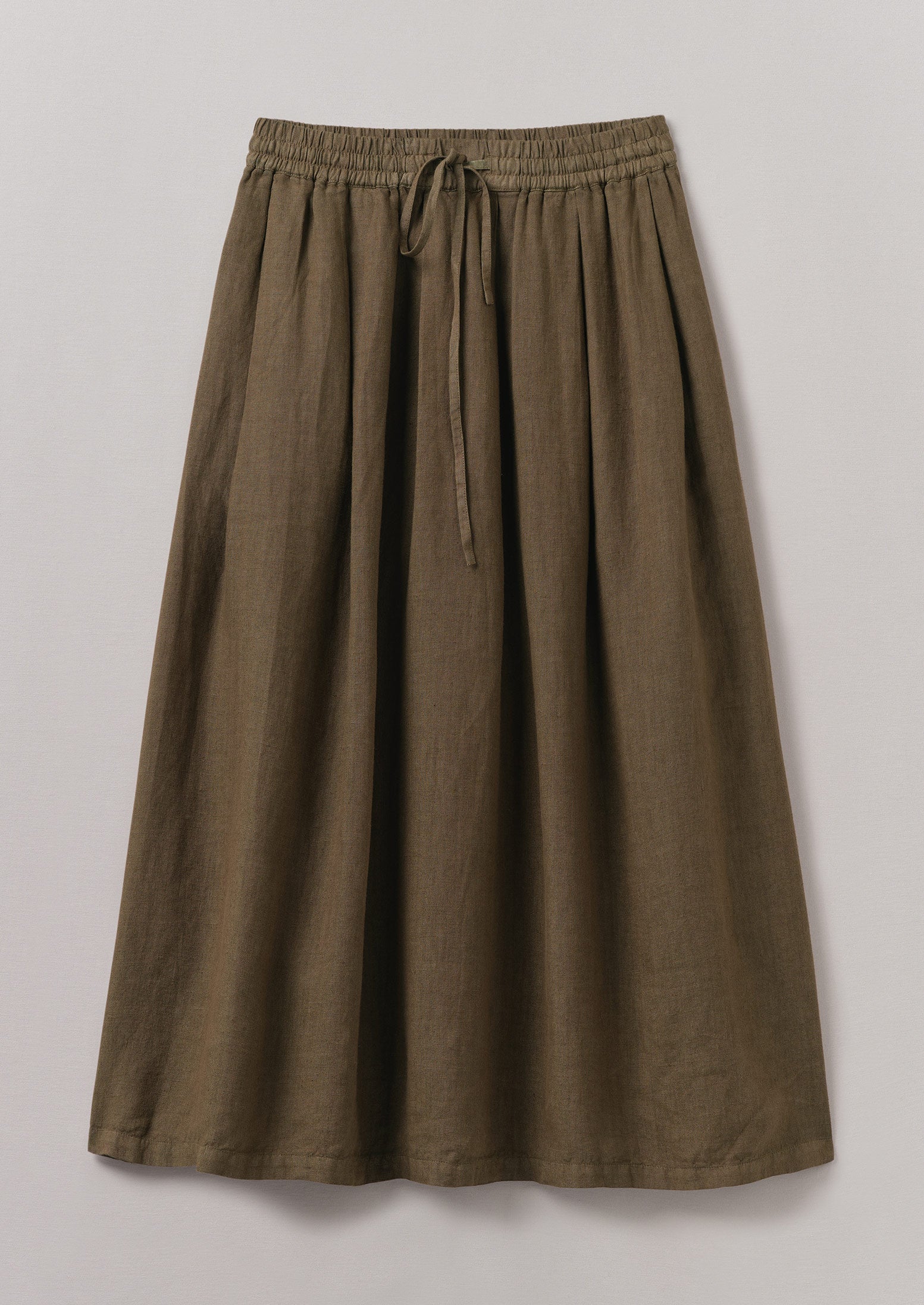 La nostra gonna è tinta in capo e presenta un elastico in vita e un cordino per regolarne la vestibilità. Ha un taglio comodo, tasche sulla cucitura laterale e lunghezza al polpaccio.
