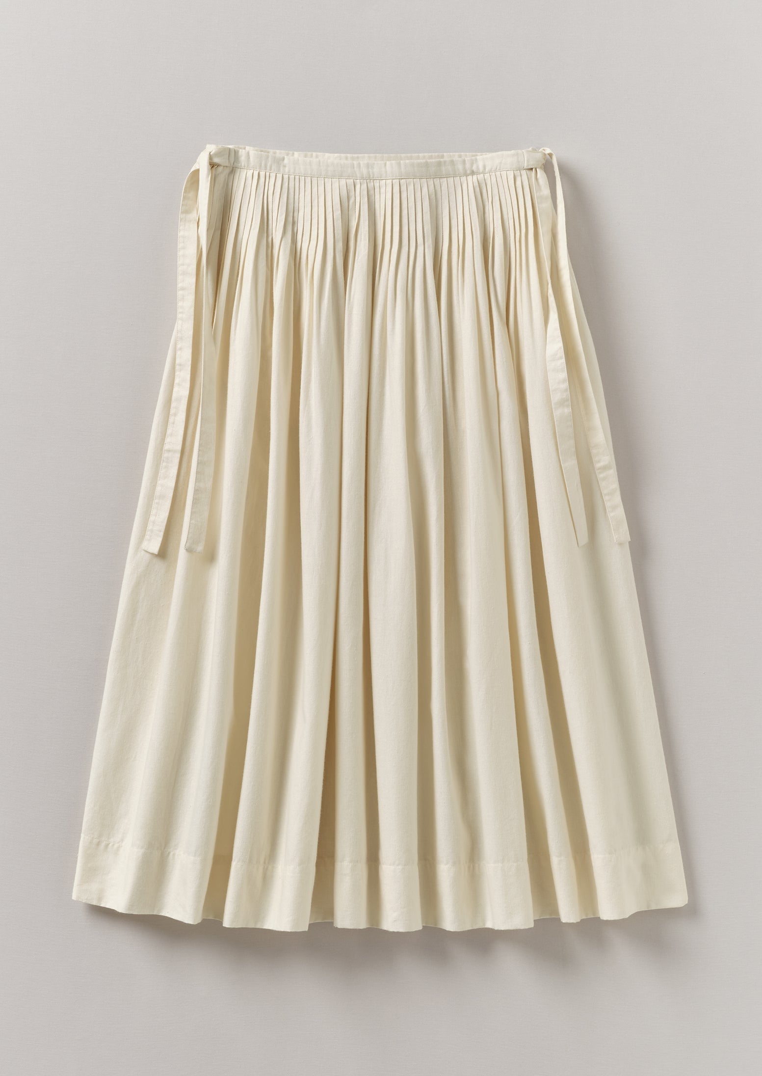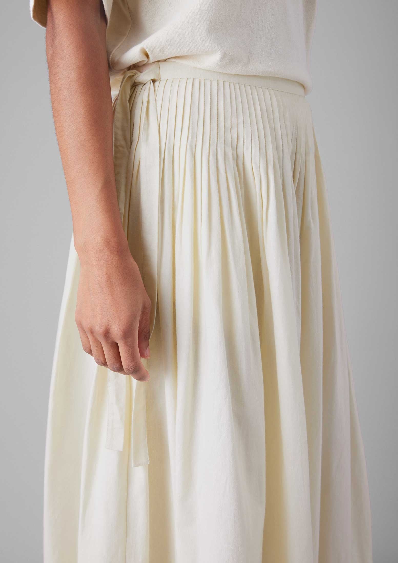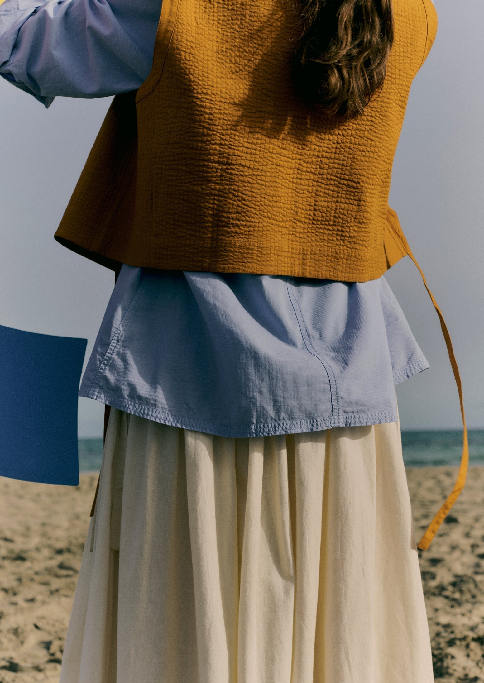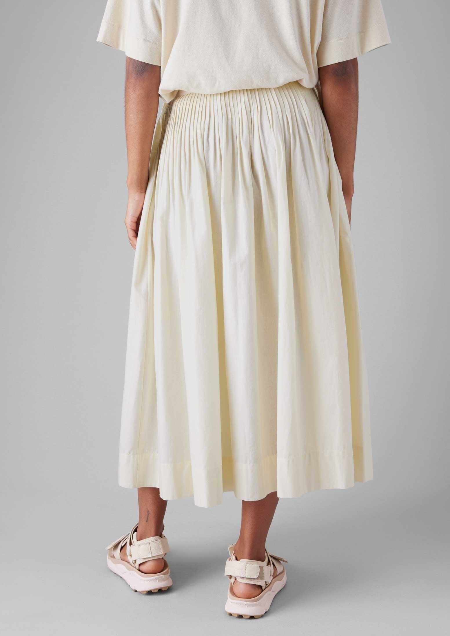 Realizzata in cotone e lino, la gonna presenta pieghe a pieghe che le conferiscono volume. Cade fino al polpaccio e presenta chiusure con lacci. Chiusura laterale con bottoni in corozo in vita. Rifinita con tasche laterali.