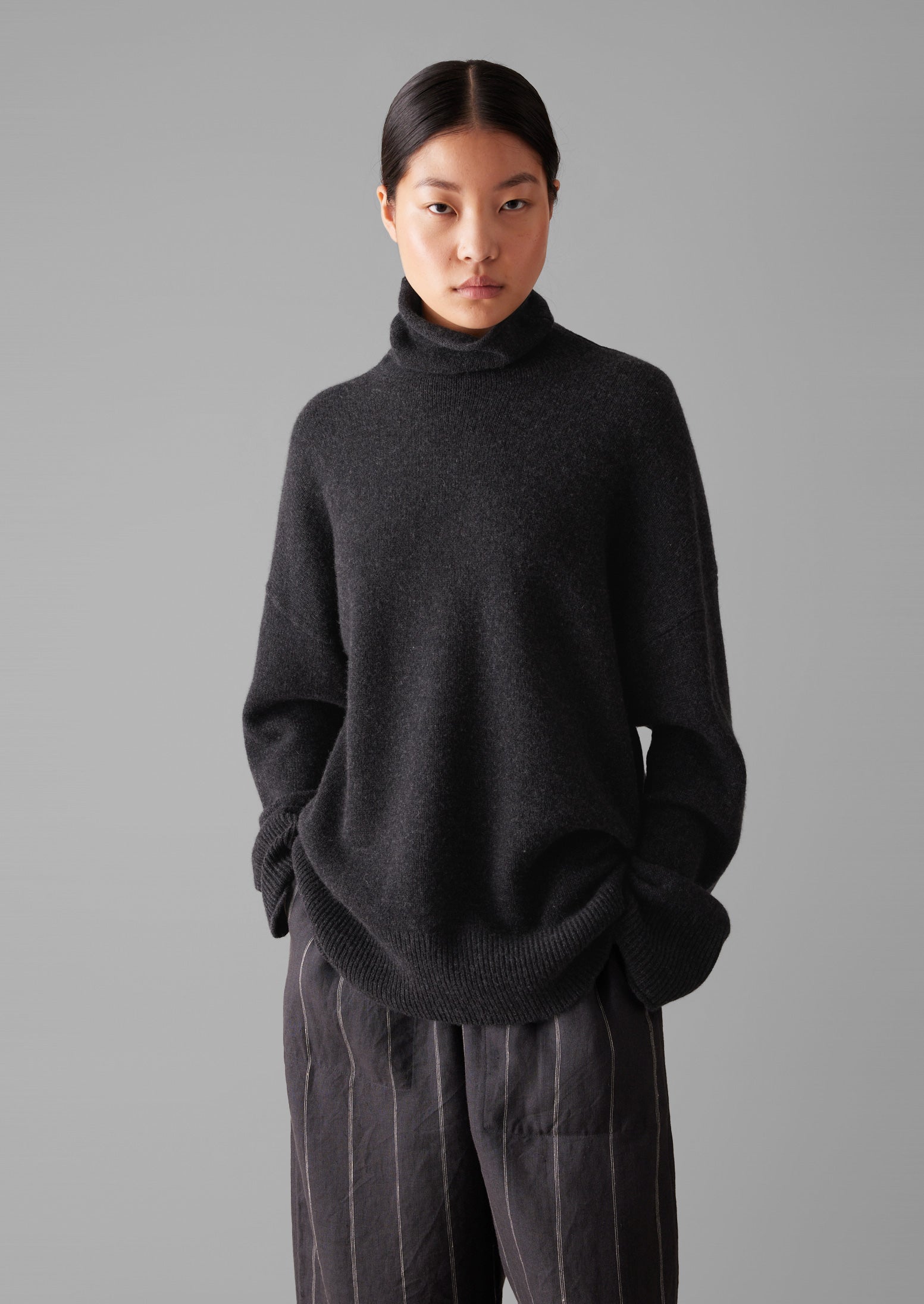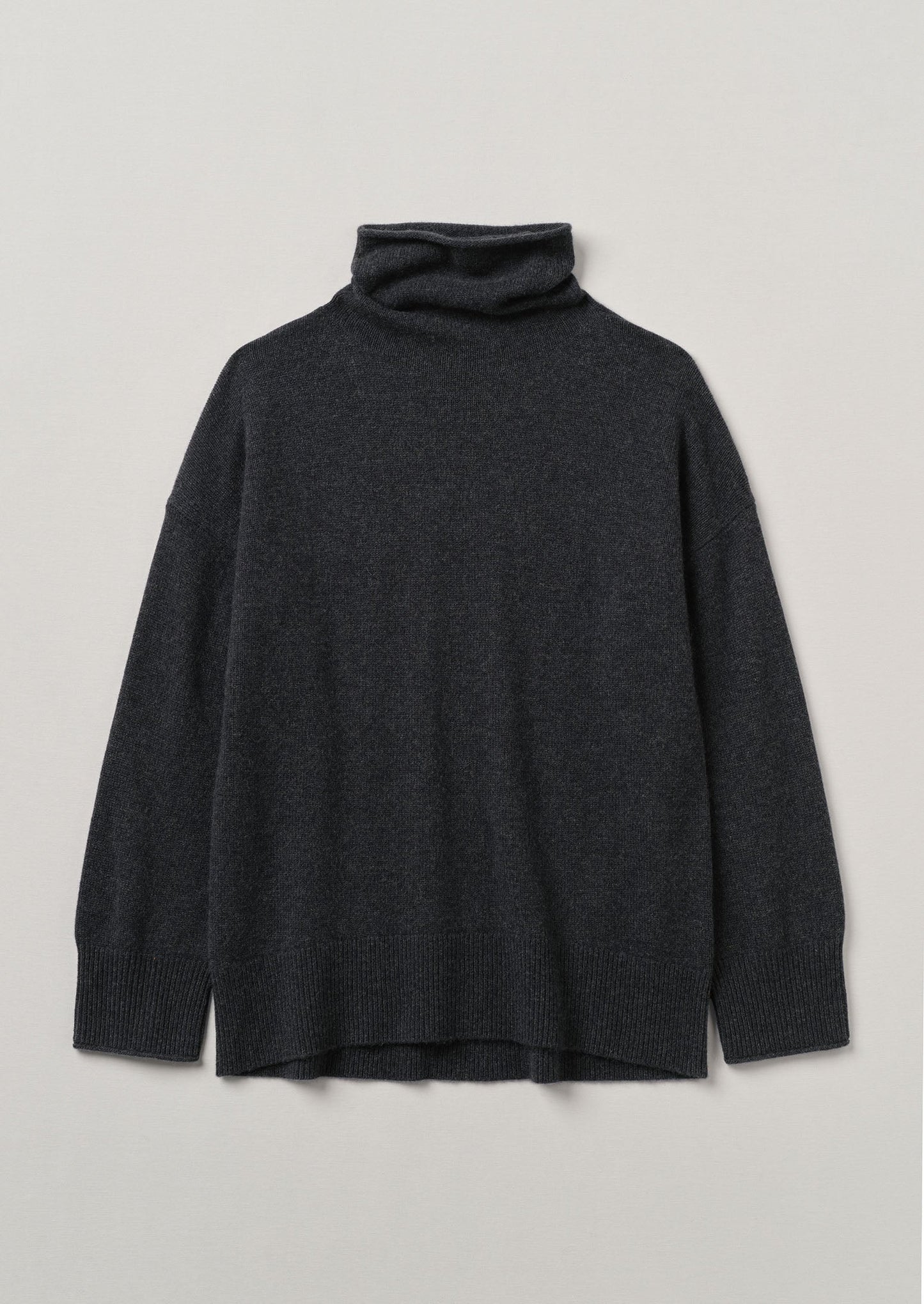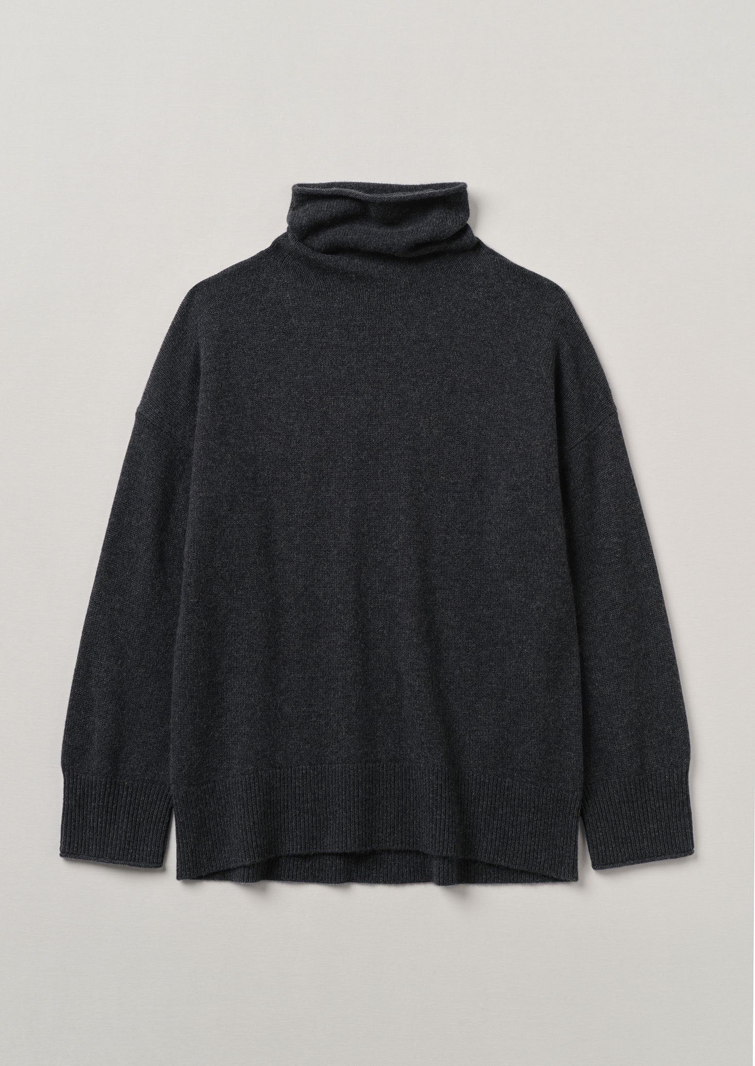 Il collo alto morbido dona un tocco di comfort al nostro maglione, realizzato in lana e cashmere riciclato. La silhouette è rilassata, con maniche scese e bordi arrotolati su collo e polsini.