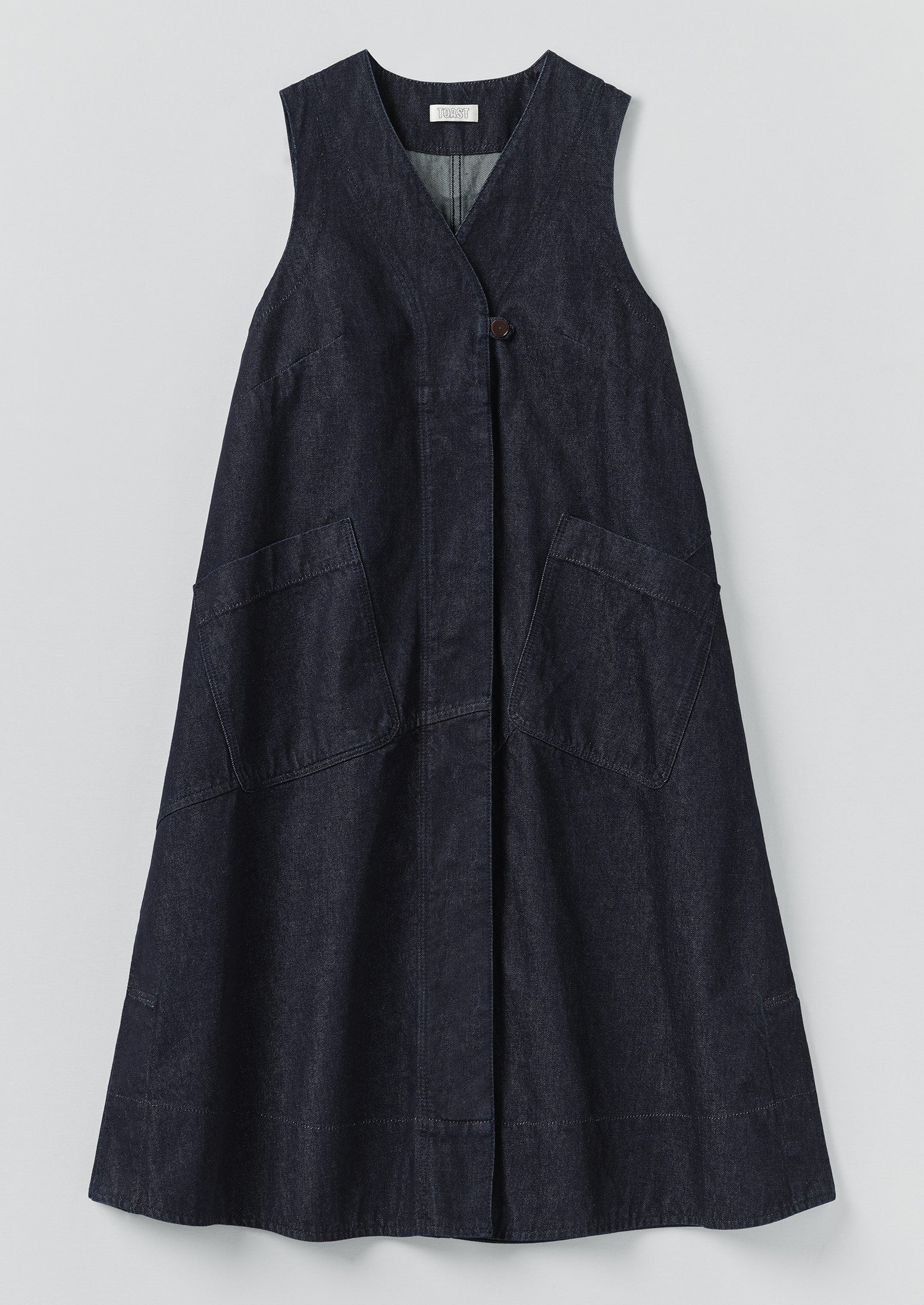 Il nostro abito tunica in denim senza maniche ha una linea a trapezio con una scollatura a V poco profonda. Le cuciture ribattute e le ampie tasche applicate richiamano l'abbigliamento da lavoro, mentre le cuciture asimmetriche corrono sul davanti e sul retro. L'abito si chiude con una patta nascosta per una finitura pulita e disinvolta.